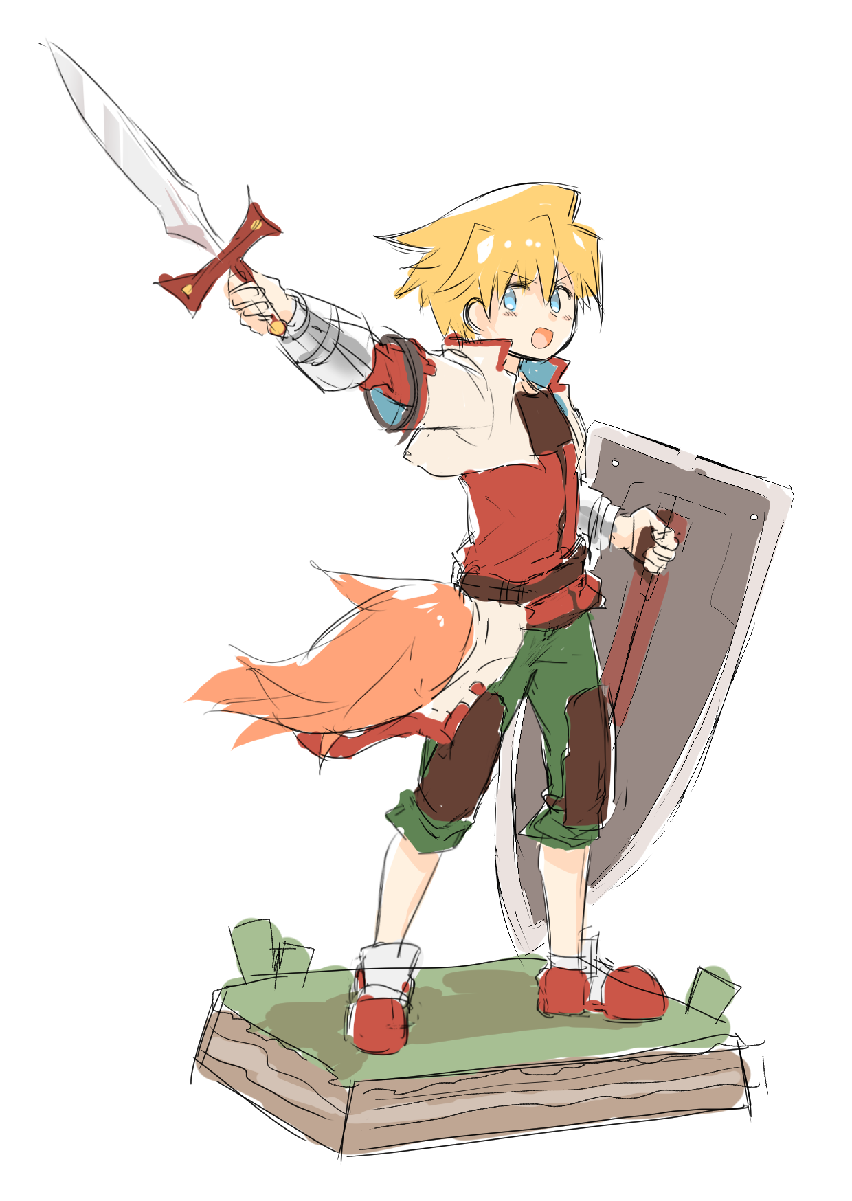 1boy ahonobo allen_llewellyn blonde_hair blue_eyes commentary_request faux_figurine green_pants highres holding holding_shield holding_sword holding_weapon long_hair male_focus open_mouth pants road_to_dragons shield simple_background sketch solo sword tail weapon white_background