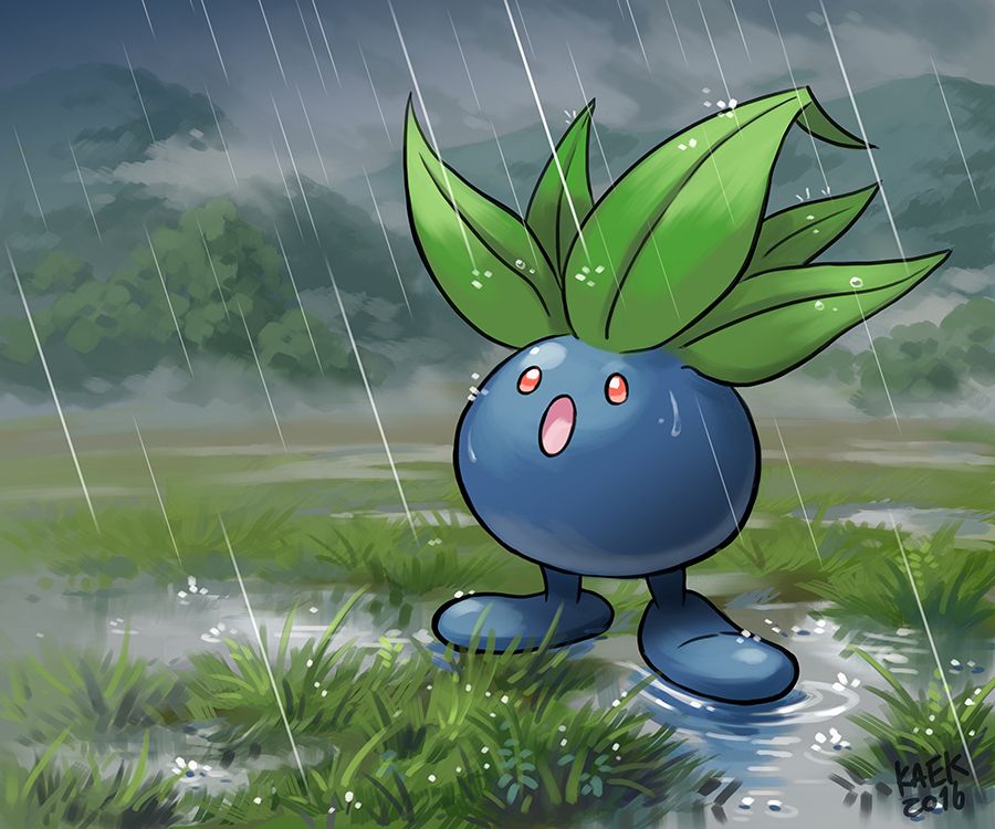 :o artist_name commentary dated english_commentary full_body gen_1_pokemon grass kaek_art nintendo no_humans oddish open_mouth outdoors pokemon pokemon_(creature) pokemon_focus puddle rain sky solo water wet