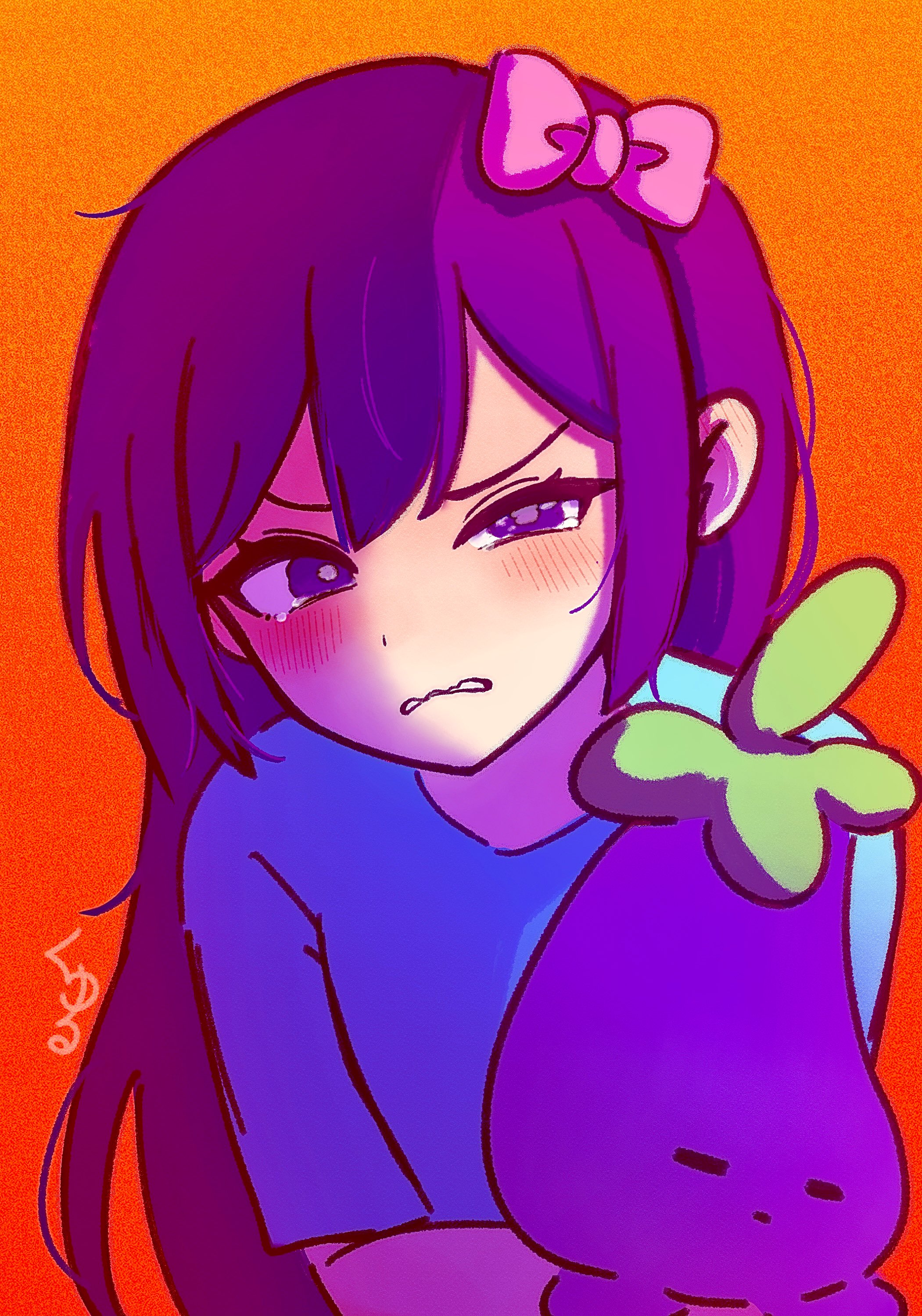 1girl absurdres angry aubrey_(faraway)_(omori) aubrey_(omori) blue_shirt blush bow commentary_request double-parted_bangs hair_between_eyes hair_bow highres holding holding_stuffed_toy looking_at_viewer mr._plantegg_(omori) omori parted_lips pink_bow purple_eyes purple_hair shirt short_sleeves sidelocks solo stuffed_animal stuffed_toy t-shirt tearing_up upper_body yu_kuli
