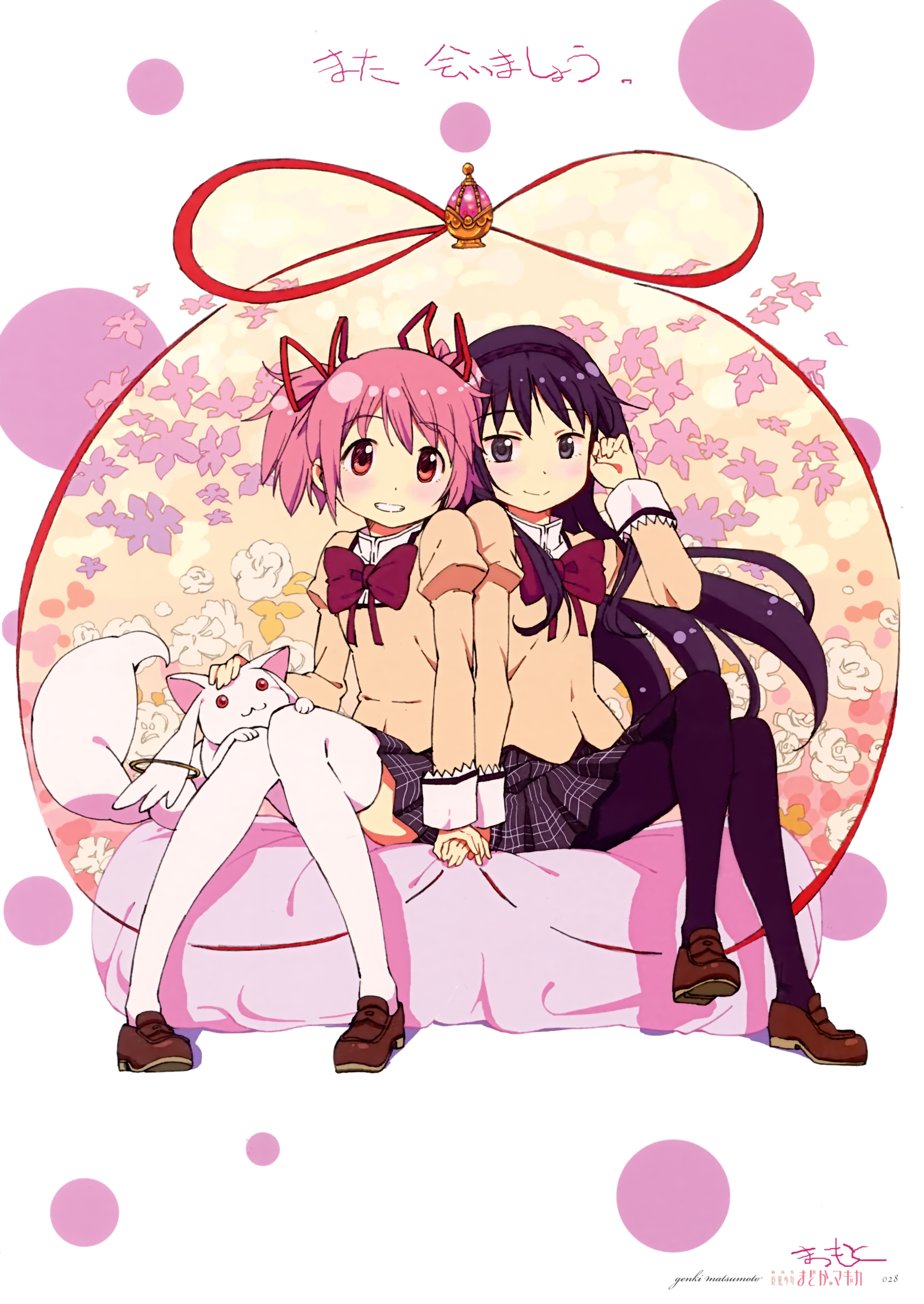 2girls absurdres akemi_homura artbook back-to-back black_hair black_hairband black_pantyhose black_skirt blush bow bowtie brown_shoes child closed_mouth collared_shirt creature crossed_legs dot_nose dotted_background gengoro grey_eyes grin hair_ribbon hairband hand_grab high_collar highres juliet_sleeves kaname_madoka knees_together_feet_apart kyubey lace-trimmed_sleeves lace_trim loafers long_sleeves looking_at_viewer mahou_shoujo_madoka_magica mahou_shoujo_madoka_magica_(anime) miniskirt mitakihara_school_uniform multiple_girls official_art pantyhose petting pink_eyes pink_hair plaid_clothes plaid_skirt pleated_skirt puffy_sleeves red_bow red_bowtie red_ribbon ribbon scan school_uniform shirt shoes short_twintails sitting skirt sleeve_cuffs smile soul_gem string string_of_fate sweater thighhighs third-party_source too_many_flowers translation_request twintails white_background white_shirt white_thighhighs yellow_sweater