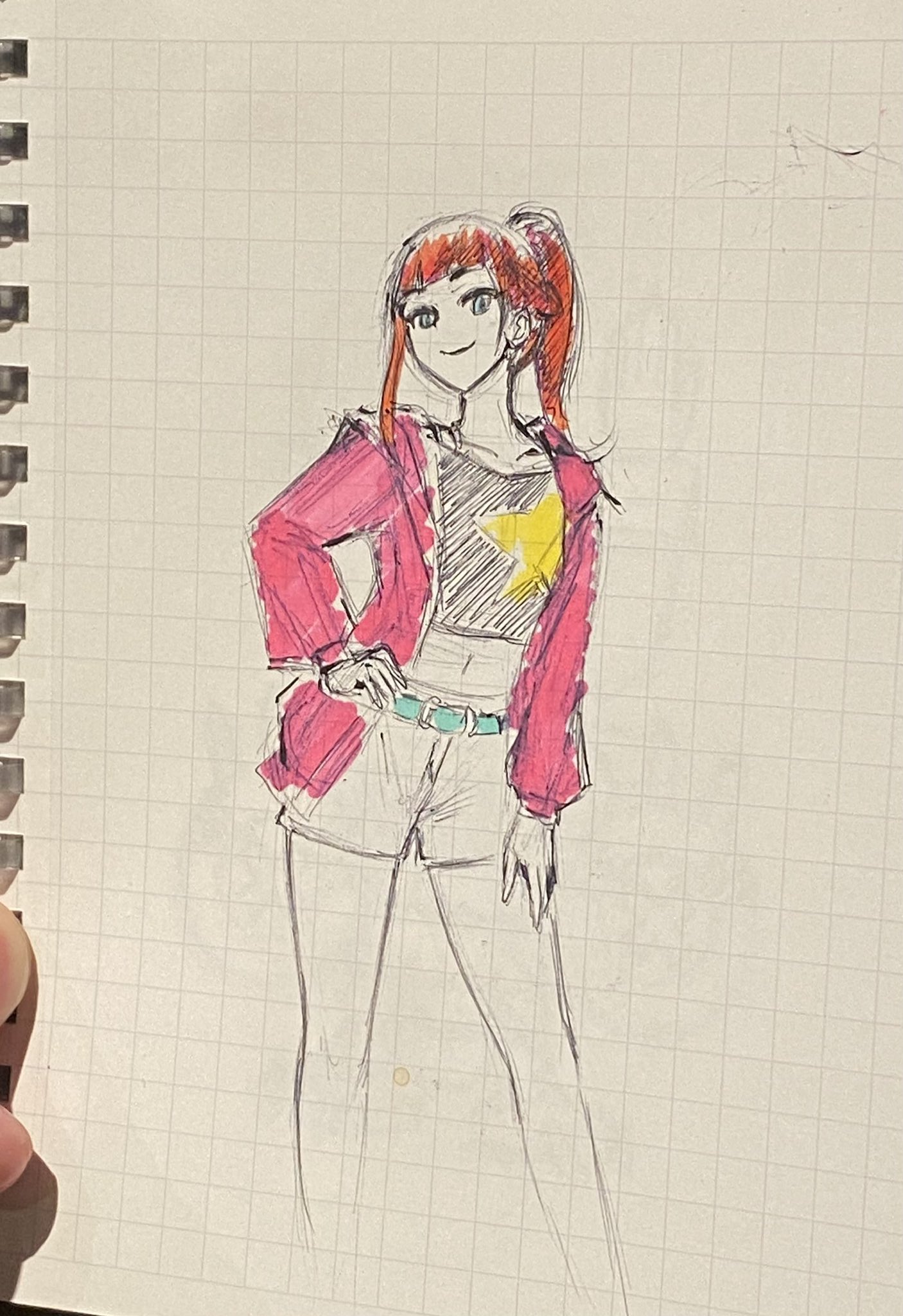 belt beta_design digimon digimon_beatbreak jacket long_hair looking_at_viewer mas_square ponytail sakuya_reina smile star_(symbol) traditional_media