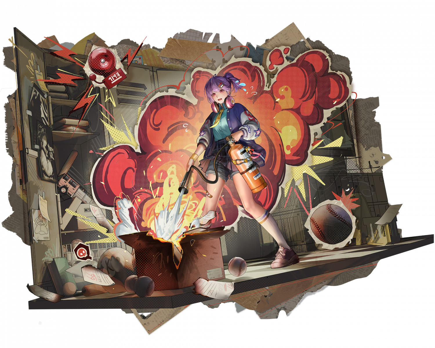 academic_test aqua_shirt artist_request bandaid bandaid_on_leg baseball baseball_bat baseball_cap book burnt_paper character_charm charm_(object) denim denim_shorts ducky_(path_to_nowhere) electric_alarm fire fire_extinguisher fire_truck flora_(path_to_nowhere) flying_sweatdrops hair_ornament hairclip hat headphones headphones_around_neck highres holding_fire_extinguisher jacket letterman_jacket motor_vehicle necktie official_art open_locker open_mouth parallel_hairclips path_to_nowhere plaid_clothes plaid_skirt poster_(object) purple_hair red_eyes shirt shorts shorts_under_skirt skirt spoken_skull test_score toy_truck truck wet_floor_sign yellow_necktie