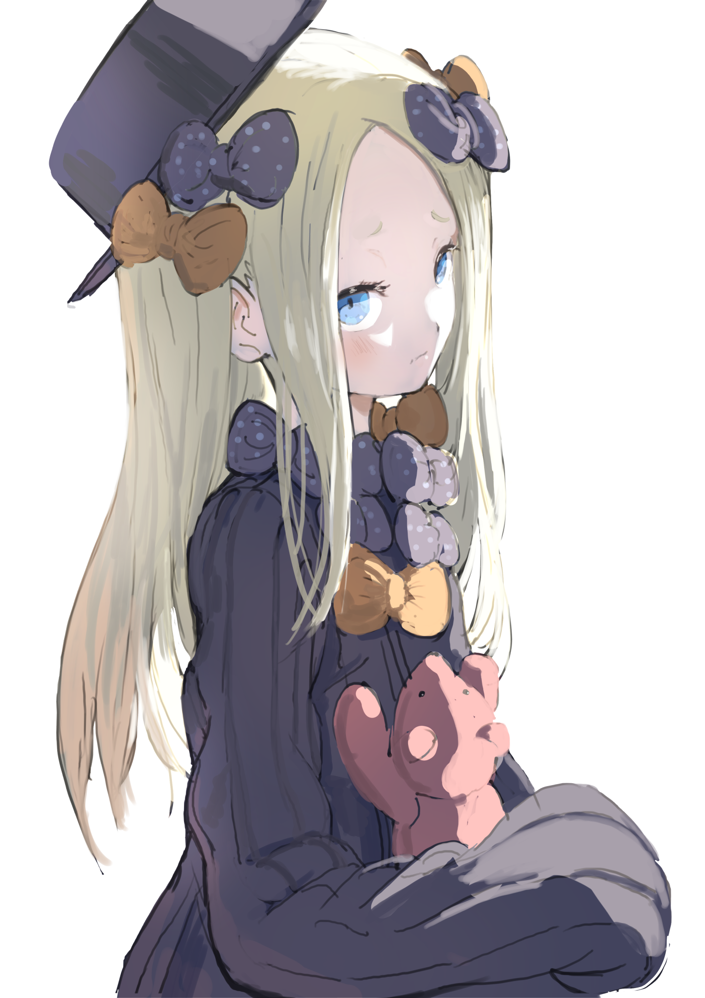 1girl abigail_williams_(fate) blonde_hair blue_eyes bow fate/grand_order fate_(series) forehead hair_bow hat highres holding holding_stuffed_toy key_chan long_hair looking_at_viewer multiple_hair_bows parted_bangs simple_background sleeves_past_fingers sleeves_past_wrists solo stuffed_animal stuffed_toy twintails upper_body white_background