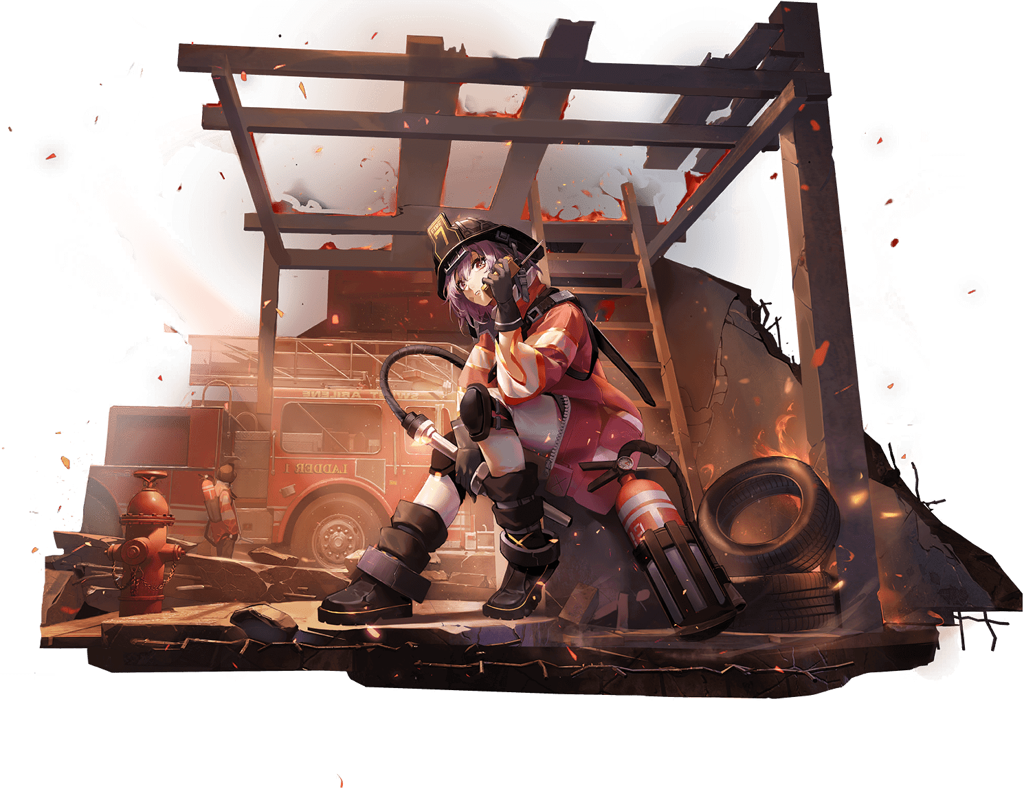 1girl backwards_text destruction fire fire_extinguisher fire_helmet fire_hydrant fire_truck firefighter firefighter_jacket flora_(path_to_nowhere) holding holding_hose holding_walkie-talkie hose hose_nozzle jacket knee_pads ladder motor_vehicle official_art path_to_nowhere purple_hair red_eyes truck unused_tire walkie-talkie