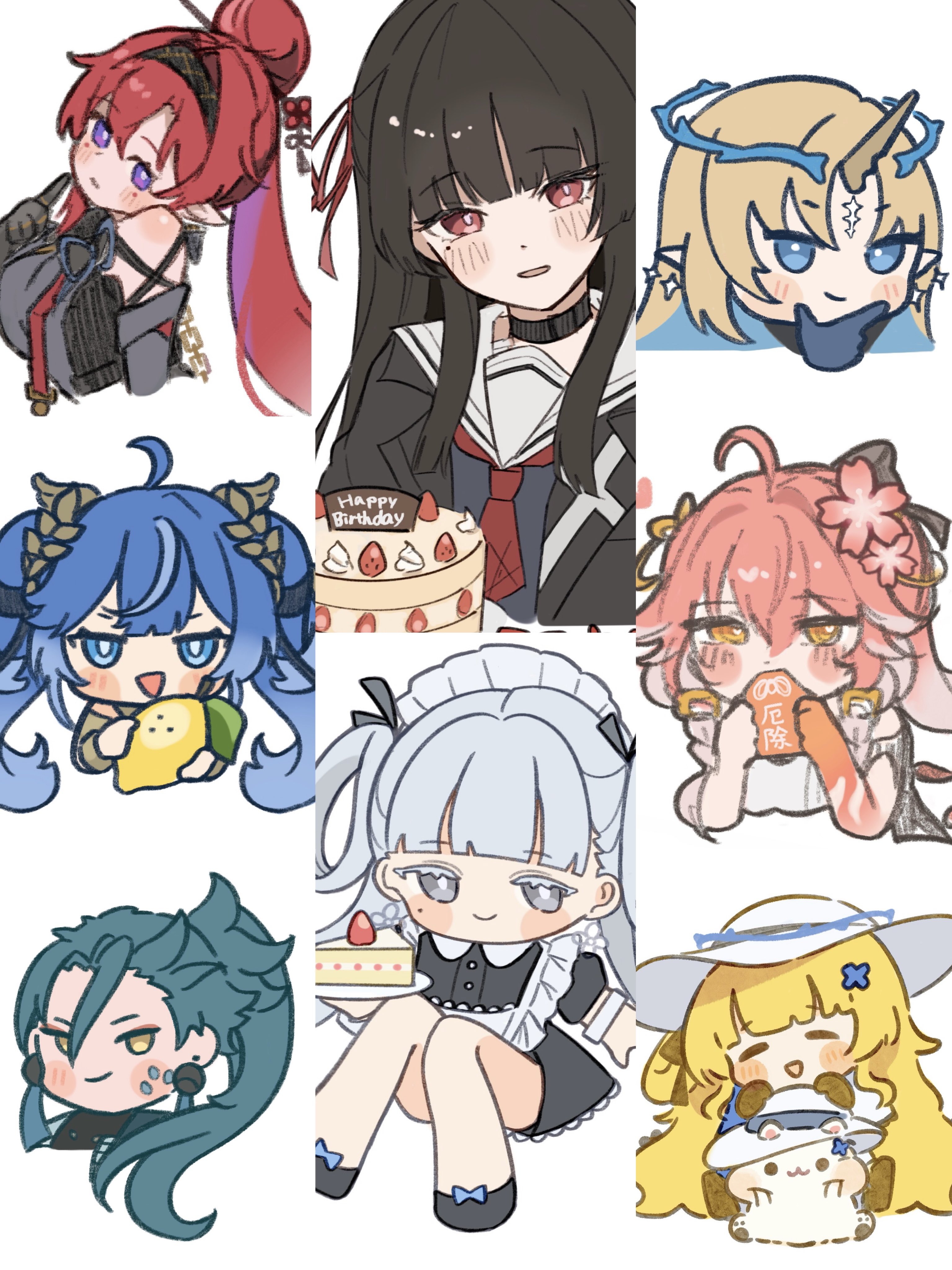 1010_(wuthering1010) 1boy 6+girls absurdres ahoge alternate_costume birthday_cake black_choker black_dress black_hair black_hairband blonde_hair blue_eyes blue_hair blunt_bangs blush cake changli_(wuthering_waves) chisa_(wuthering_waves) choker colored_eyelashes commentary_request dress emoji enmaided fleurdelys_(wuthering_waves) food fruit green_hair grey_eyes hairband happy_birthday hat highres holding holding_food holding_fruit iuno_(wuthering_waves) jinhsi_(wuthering_waves) jiyan_(wuthering_waves) laurel_crown lemon long_hair looking_at_viewer maid multicolored_hair multiple_girls open_mouth phoebe_(wuthering_waves) pink_hair ponytail purple_eyes red_eyes red_hair sailor_collar smile streaked_hair thinking_emoji twintails white_eyelashes white_hair white_hat white_sailor_collar wuthering_waves yinlin_(wuthering_waves)