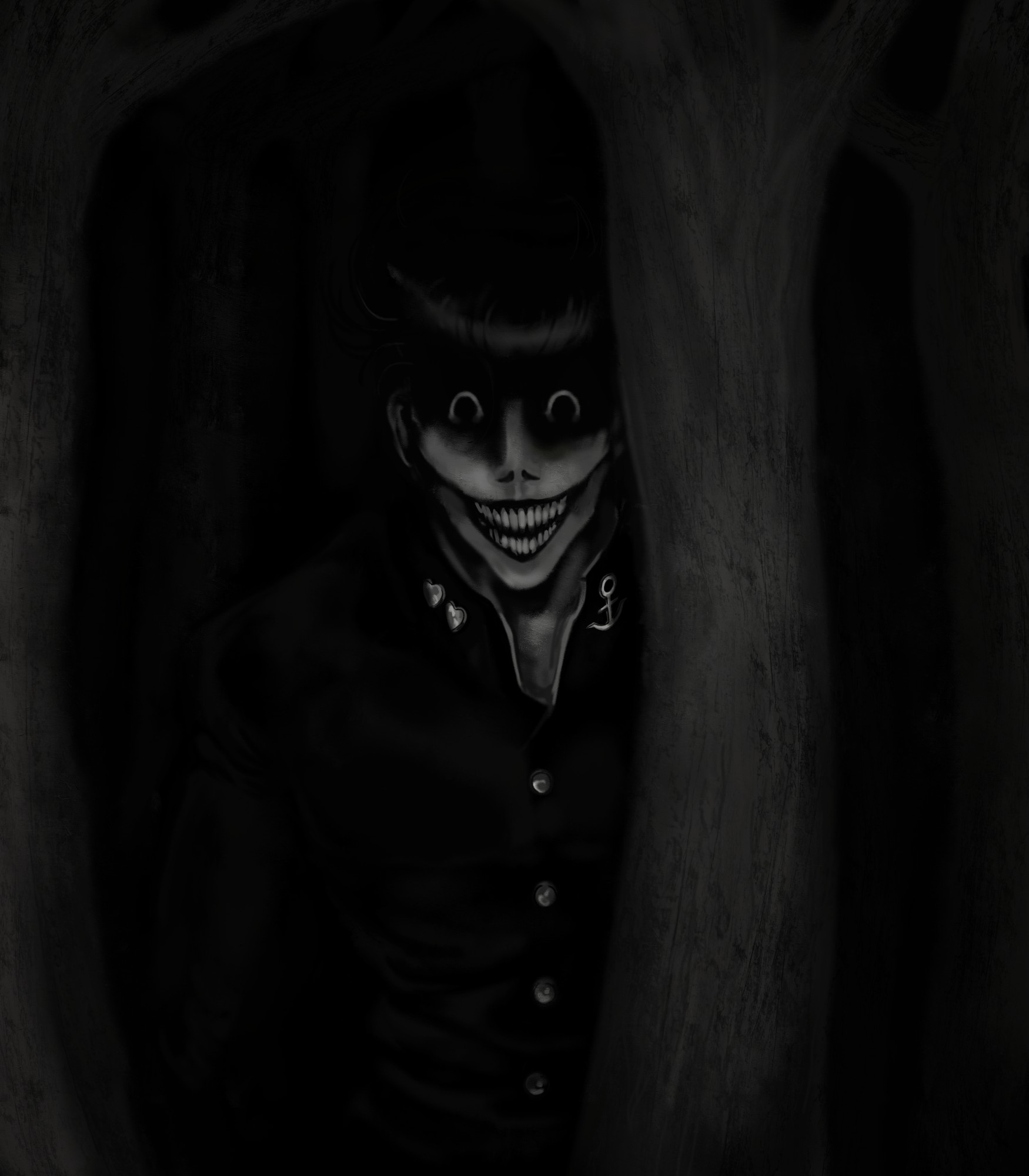 1boy black_hair commentary diamond_wa_kudakenai english_commentary gakuran greyscale grin higashikata_josuke highres horror_(theme) jojo_no_kimyou_na_bouken looking_at_viewer male_focus monochrome pompadour rimmybone sanpaku school_uniform smile solo teeth tree
