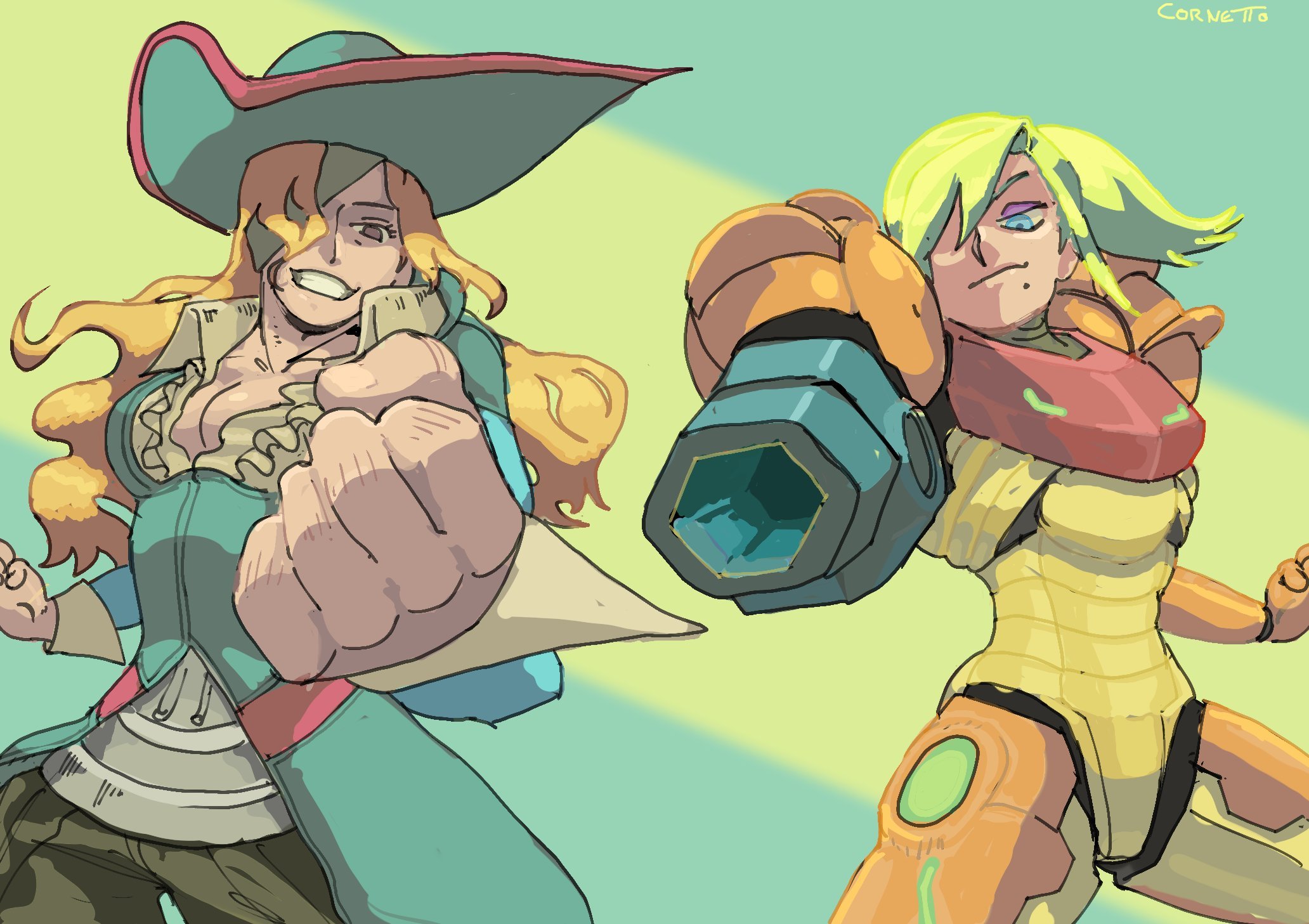 2girls aiming arm_cannon armor blonde_hair blue_eyes breasts brown_eyes capcom cleavage clenched_hand clenched_hands clenched_teeth commentary cornettoart cosplay crossover english_commentary eyeshadow foreshortening hair_over_one_eye hat highres large_breasts long_hair looking_at_viewer makeup marvel_vs._capcom marvel_vs._capcom_2 metroid mole mole_under_mouth multiple_girls nintendo orange_hair pointing pointing_at_viewer ponytail power_armor power_suit power_suit_(metroid) ruby_heart samus_aran short_hair smile smug teeth varia_suit weapon