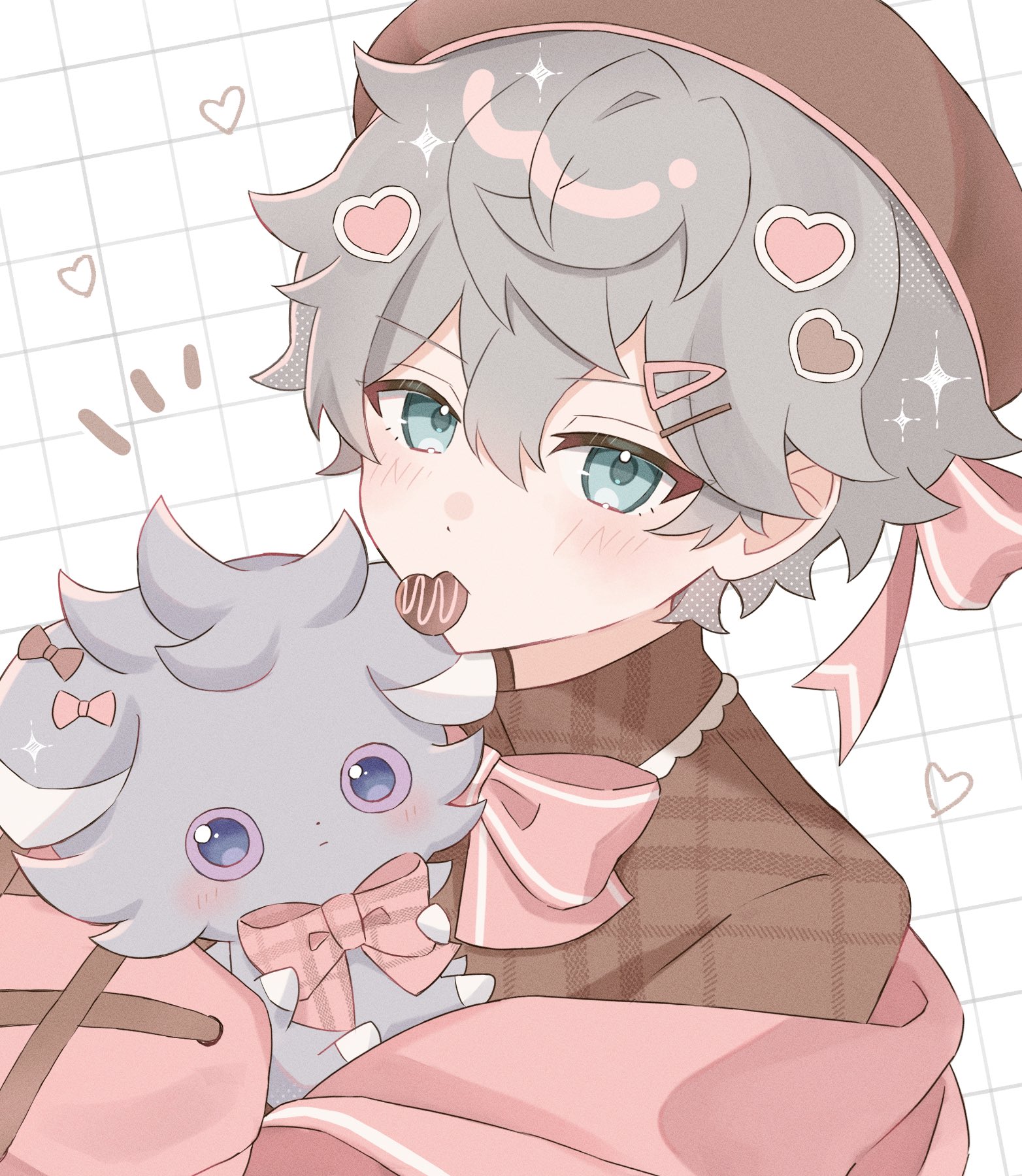 1boy blue_eyes bow brown_bow brown_hat brown_shirt candy chocolate chocolate_heart color_connection commentary ensemble_stars! espurr food food_in_mouth gen_6_pokemon grey_fur grey_hair grid_background hair_between_eyes hair_bow hair_ornament hairclip hat hat_bow heart heart-shaped_food heart_hair_ornament highres holding holding_pokemon jacket jacket_partially_removed nintendo nita_(02ta_o) pink_bow pink_jacket pokemon pokemon_(creature) sena_izumi_(ensemble_stars!) shirt short_hair solo trait_connection untranslatable_commentary upper_body white_background