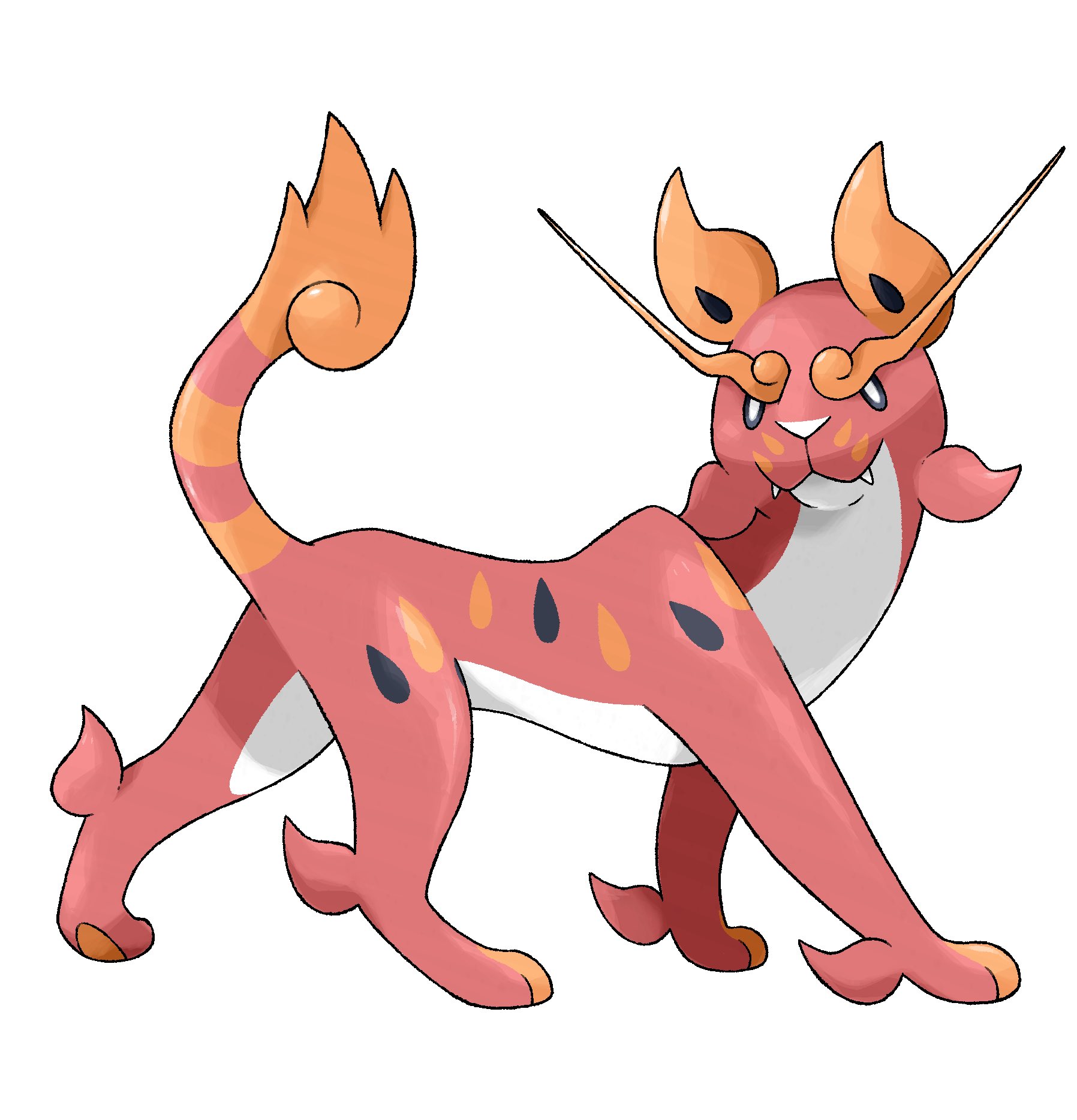 commentary english_commentary fakemon fangs greg_andrade highres jaguar long_eyebrows looking_at_viewer nintendo no_humans original pokemon pokemon_(creature) red_fur simple_background solo sugimori_ken_(style) tail white_background