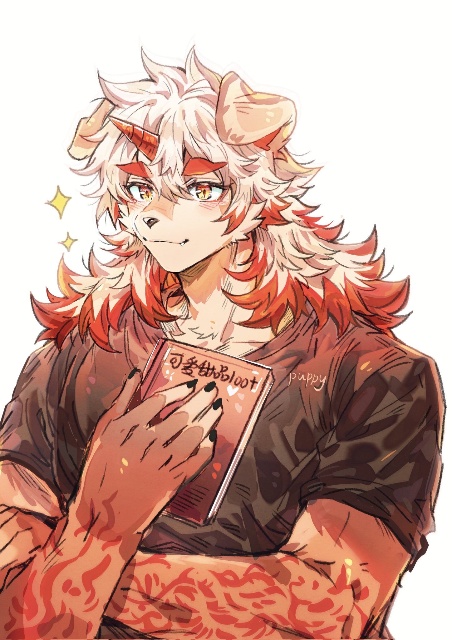 1boy arknights black_shirt blush book chinese_commentary chinese_text claws closed_mouth colored_tips commentary_request english_text fang fang_out furry furry_male highres holding holding_book horns hung_(arknights) komainu_boy komainu_ears male_focus multicolored_hair muscular muscular_male s3zwrtdyqaewnci shirt single_horn smile sparkle translation_request upper_body white_background