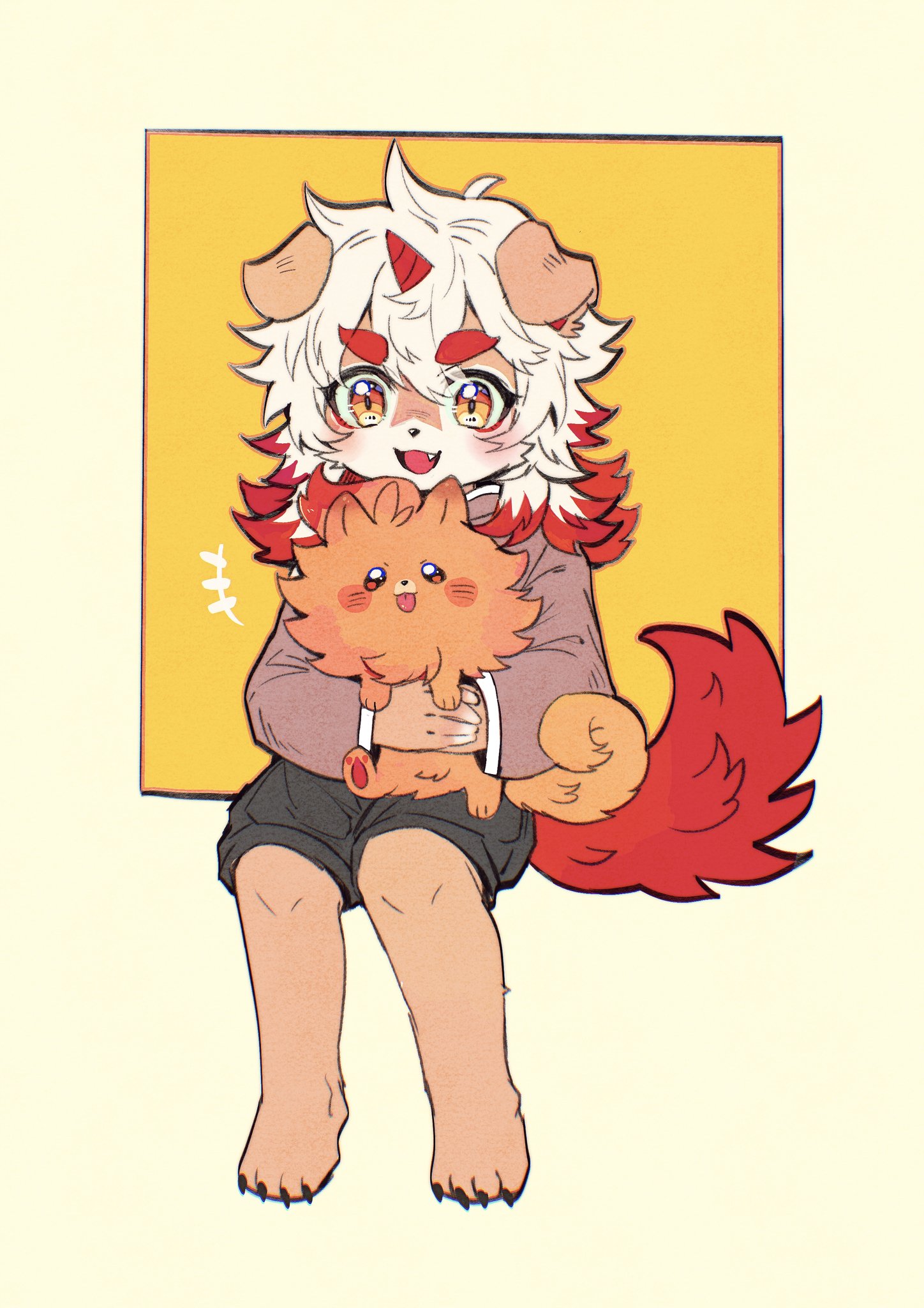 +++ 1boy 1other arknights barefoot black_shorts blush claws colored_tips commentary dog dog_tail fang full_body furry furry_male grey_shirt highres horns hung_(arknights) komainu_boy komainu_ears komainu_tail looking_at_another multicolored_hair nintendo open_mouth pawpads pokemon pokemon_(creature) pombon s3zwrtdyqaewnci shirt shorts single_horn sitting smile tail untranslatable_commentary