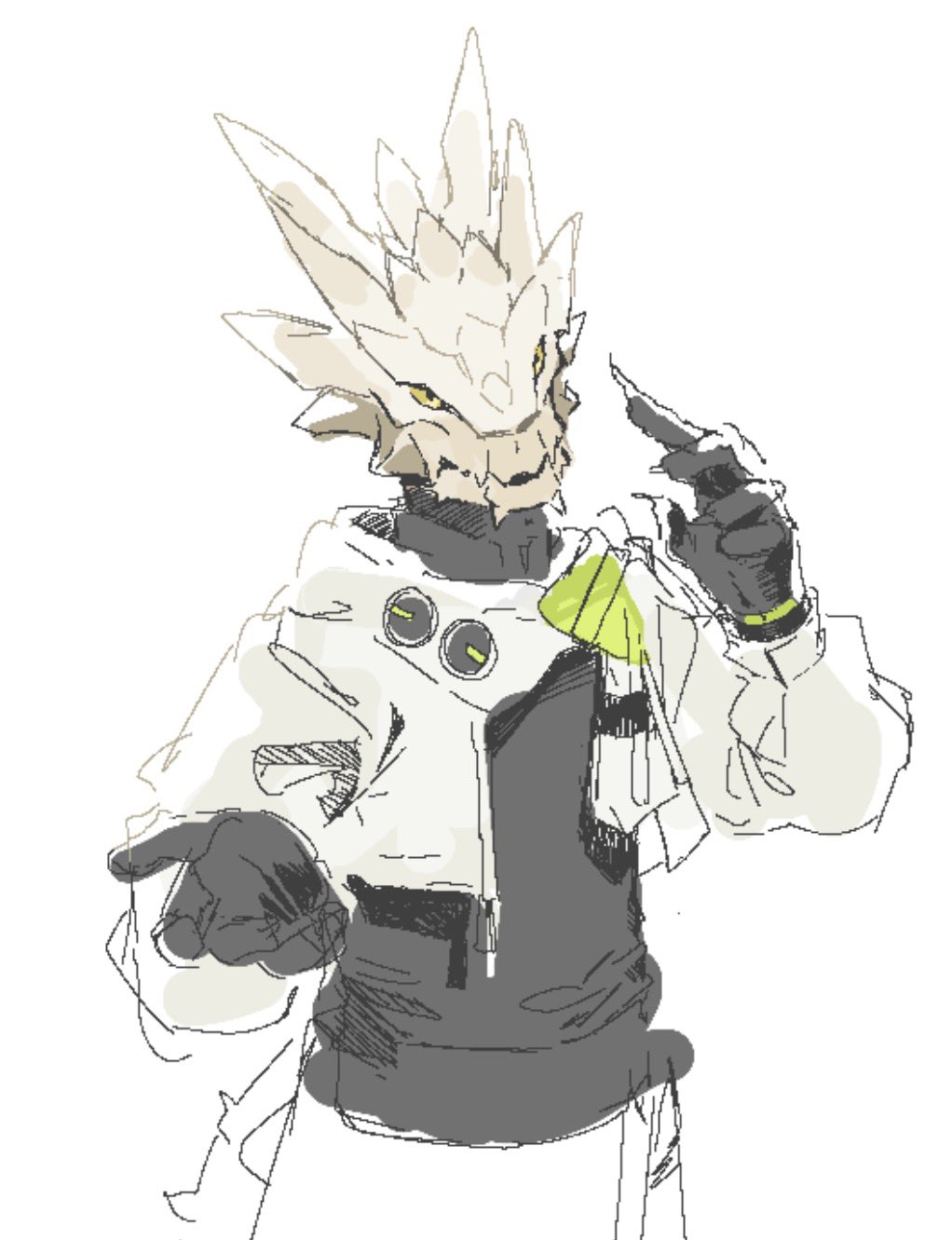 1boy antal_(arknights) arknights arknights:_endfield black_gloves black_shirt commentary_request furry furry_male gloves guni_shi3 highres jacket looking_at_viewer male_focus reptile_boy shirt white_jacket