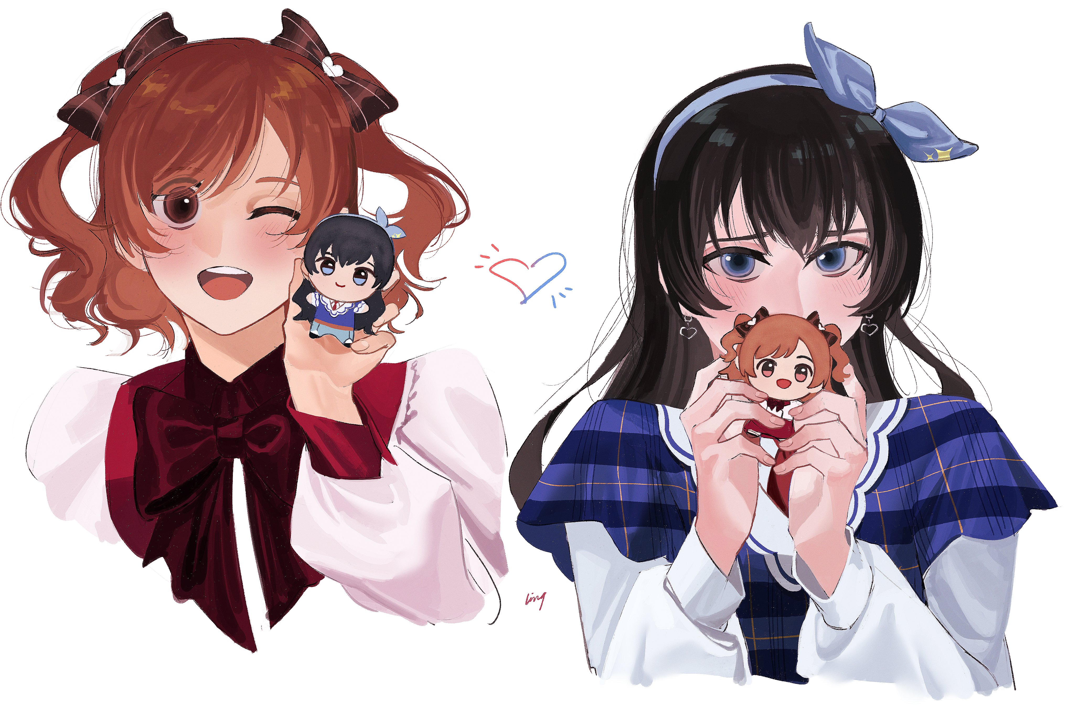 2girls ;d absurdres aijo_karen artist_name black_hair blue_eyes blue_ribbon blush bow bowtie brown_bow brown_eyes brown_hair character_doll commentary covered_mouth cropped_arms cropped_torso doll earrings hair_between_eyes hair_bow hair_ribbon hand_up hands_up heart heart_earrings highres holding holding_doll jewelry kagura_hikari ling_(chaaaaanhikari) long_hair long_sleeves looking_at_viewer multiple_girls official_alternate_costume one_eye_closed open_mouth plaid_clothes plaid_shirt print_ribbon puffy_long_sleeves puffy_sleeves red_bow red_bowtie red_shirt ribbon shirt short_hair shoujo_kageki_revue_starlight simple_background smile sparkle_print teeth two-tone_shirt two_side_up upper_body upper_teeth_only white_background white_shirt