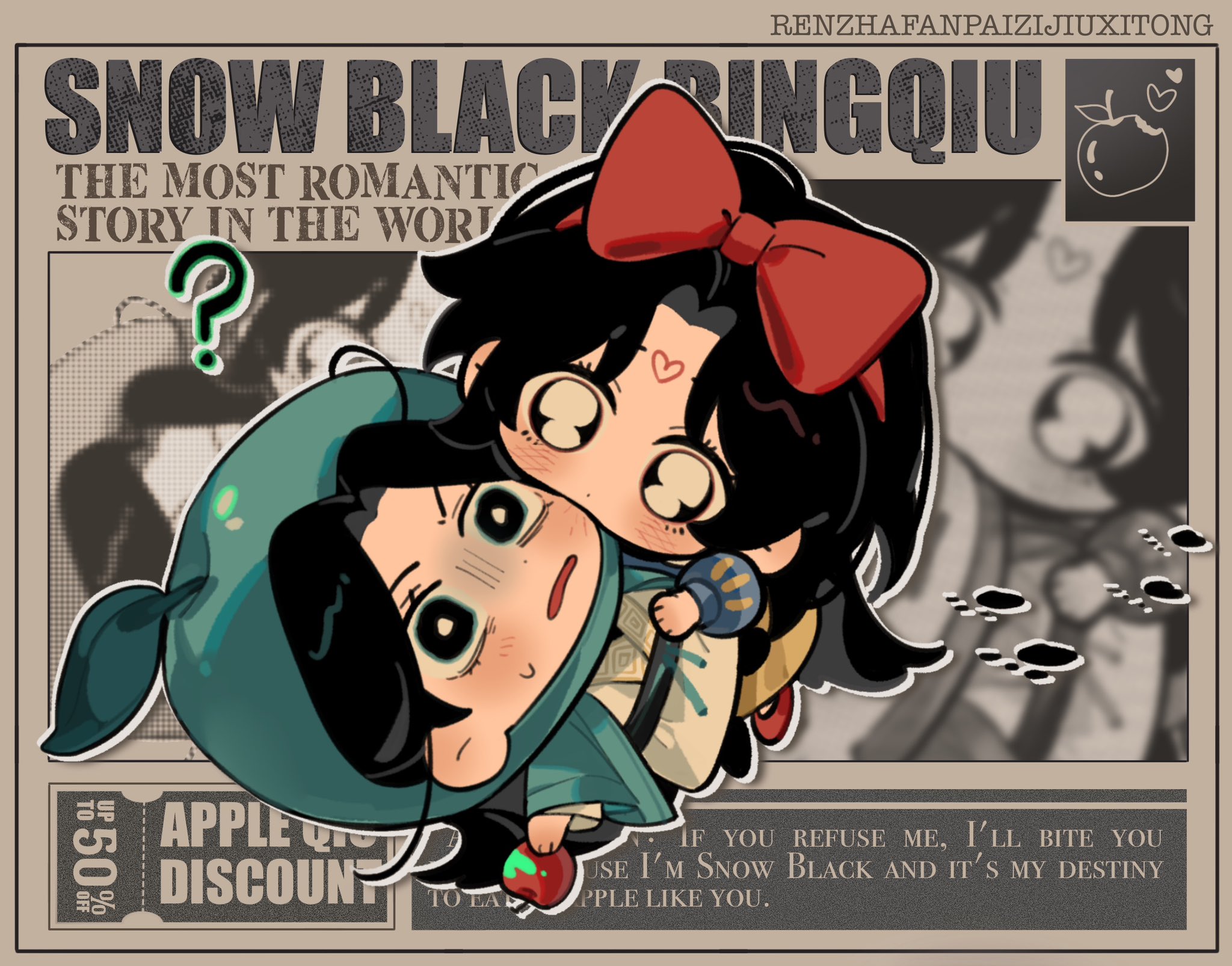 2boys ? alternate_costume antenna_hair apple apple_costume biting biting_cheek black_hair black_sash black_shoes blue_shirt blush bow bow_hairband brown_background chibi chibi_only chinese_clothes confused constricted_pupils copyright_name cosplay coupon curtained_hair disney dot_nose english_text facial_mark food food_bite forehead_mark fruit furrowed_brow green_robe hair_bow hairband hanfu heart highres holding holding_food holding_fruit juliet_sleeves leaf lingjing_mxtx long_hair long_sleeves looking_at_another luo_binghe male_focus multiple_boys newspaper outline parted_bangs paw_print pixelated puffy_sleeves red_bow red_shoes renzha_fanpai_zijiu_xitong robe sash shaded_face shen_qingqiu pairing_name shirt shoes side_ahoge skirt snow_white_(disney) snow_white_(disney)_(cosplay) sweatdrop v-shaped_eyebrows variant_set white_hanfu white_outline wide_sleeves yaoi yellow_skirt zoom_layer zuiyin