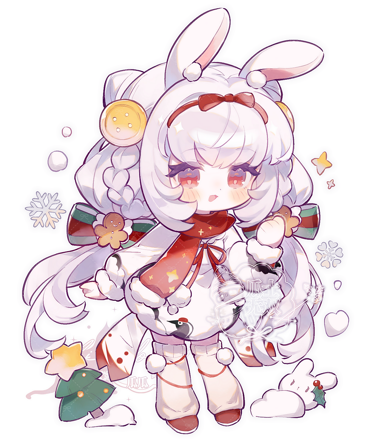 1girl animal_ears blush bow braid chibi chibi_only christmas christmas_tree dongnanbeixigua dress full_body fur-trimmed_dress fur-trimmed_sleeves fur_trim hair_bow hair_ornament hairband highres long_hair long_sleeves looking_at_viewer open_mouth original pom_pom_(clothes) pom_pom_hair_ornament rabbit rabbit_ears rabbit_girl red_bow red_eyes red_hairband red_scarf sample_watermark scarf simple_background smile snowflakes snowman socks solo thighhighs twin_braids twintails very_long_hair watermark white_background white_dress white_hair white_socks white_thighhighs