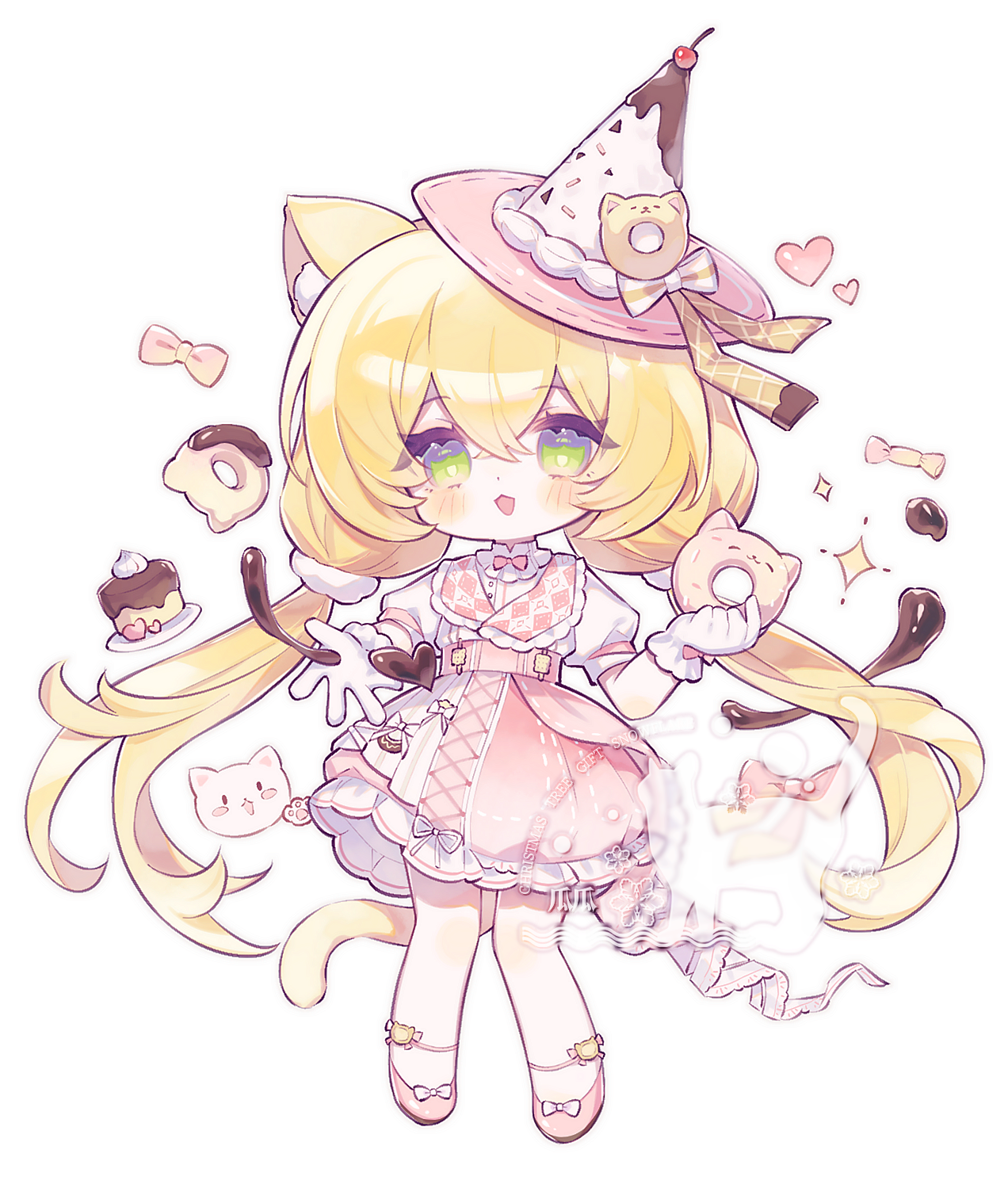 1girl animal_ear_fluff animal_ears blonde_hair blush bow cake cat cat_ears cat_girl cat_tail chibi dongnanbeixigua donut dress food full_body gloves green_eyes hair_between_eyes hat heart highres holding holding_food long_hair looking_at_viewer low_twintails open_mouth original pink_skirt puffy_short_sleeves puffy_sleeves shirt shoes short_sleeves simple_background skirt smile solo tail twintails very_long_hair white_background white_gloves white_shirt
