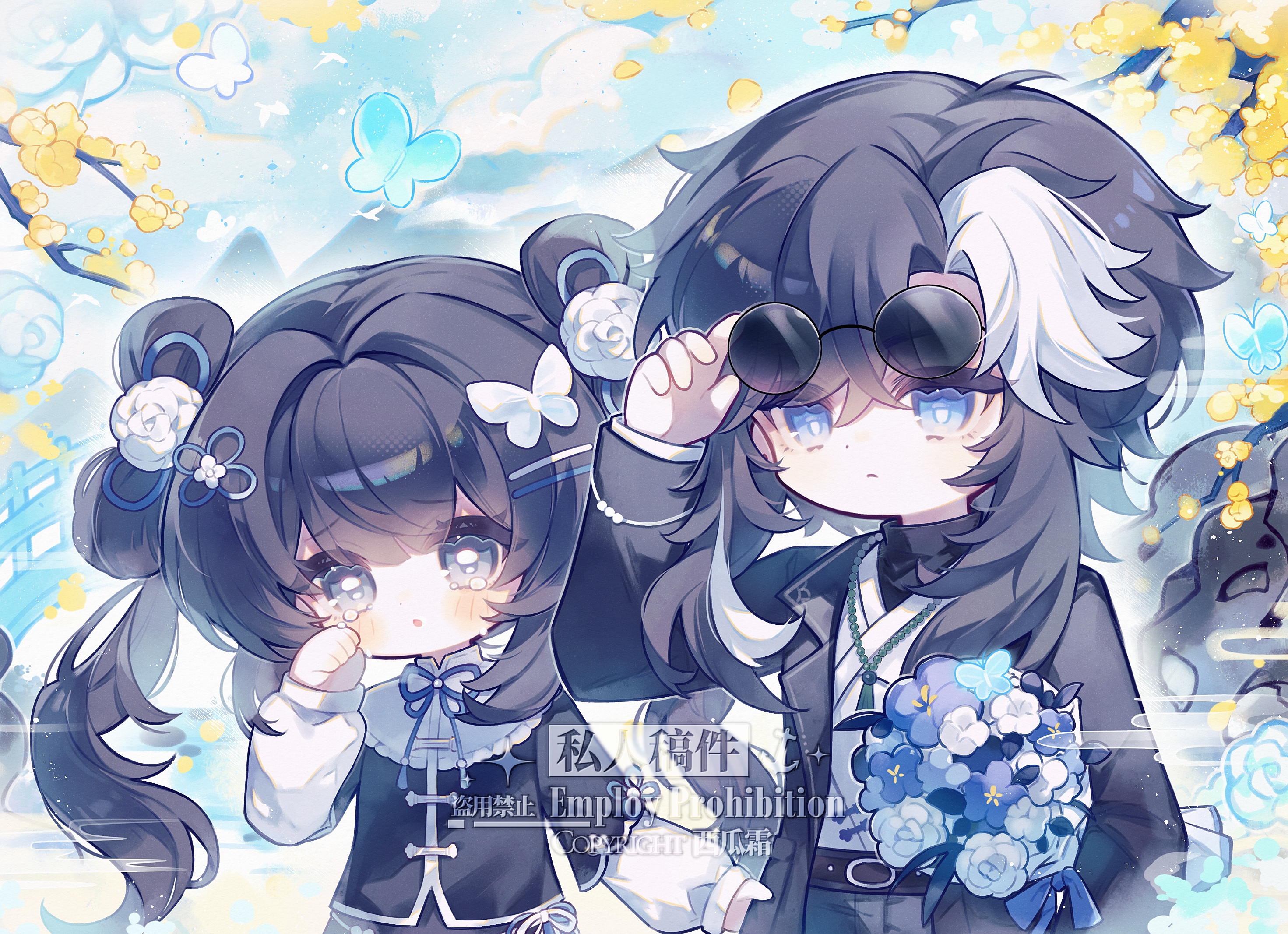 1boy 1girl adjusting_eyewear belt belt_buckle black_belt black_hair black_jacket black_pants black_shirt black_sleeves blue_bow blue_butterfly blue_eyes blue_flower blue_sky bouquet bow bowtie brown_belt buckle bug butterfly chibi chibi_only chinese_clothes closed_mouth cloud coat crying crying_with_eyes_open day dongnanbeixigua double_bun eyelashes eyewear_on_head flower frills hair_bun hair_flower hair_ornament hairclip hand_on_eyewear highres holding holding_bouquet insect jacket jewelry layered_sleeves long_hair long_sleeves multicolored_hair necklace open_clothes open_coat open_jacket original outdoors pants puffy_sleeves rose round_eyewear sample_watermark shirt sky streaked_hair sunglasses tears twintails upper_body vest watermark white_flower white_hair white_rose white_shirt