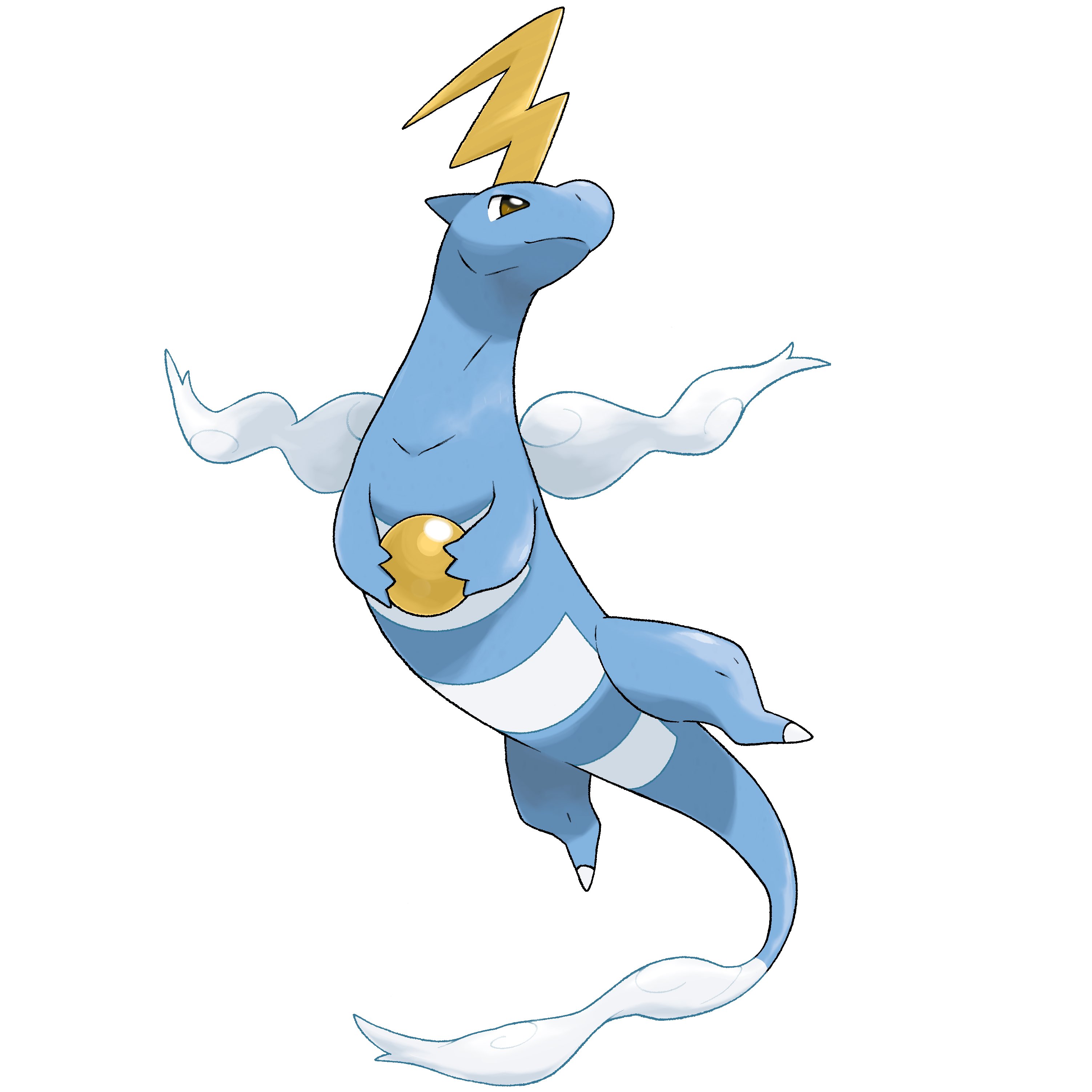 absurdres blue_skin brown_eyes colored_skin fakemon flying gold greg_andrade highres holding horns lightning_bolt_symbol looking_to_the_side nintendo no_humans original pokemon pokemon_(creature) simple_background single_horn solo sugimori_ken_(style) tail white_background yellow_horns