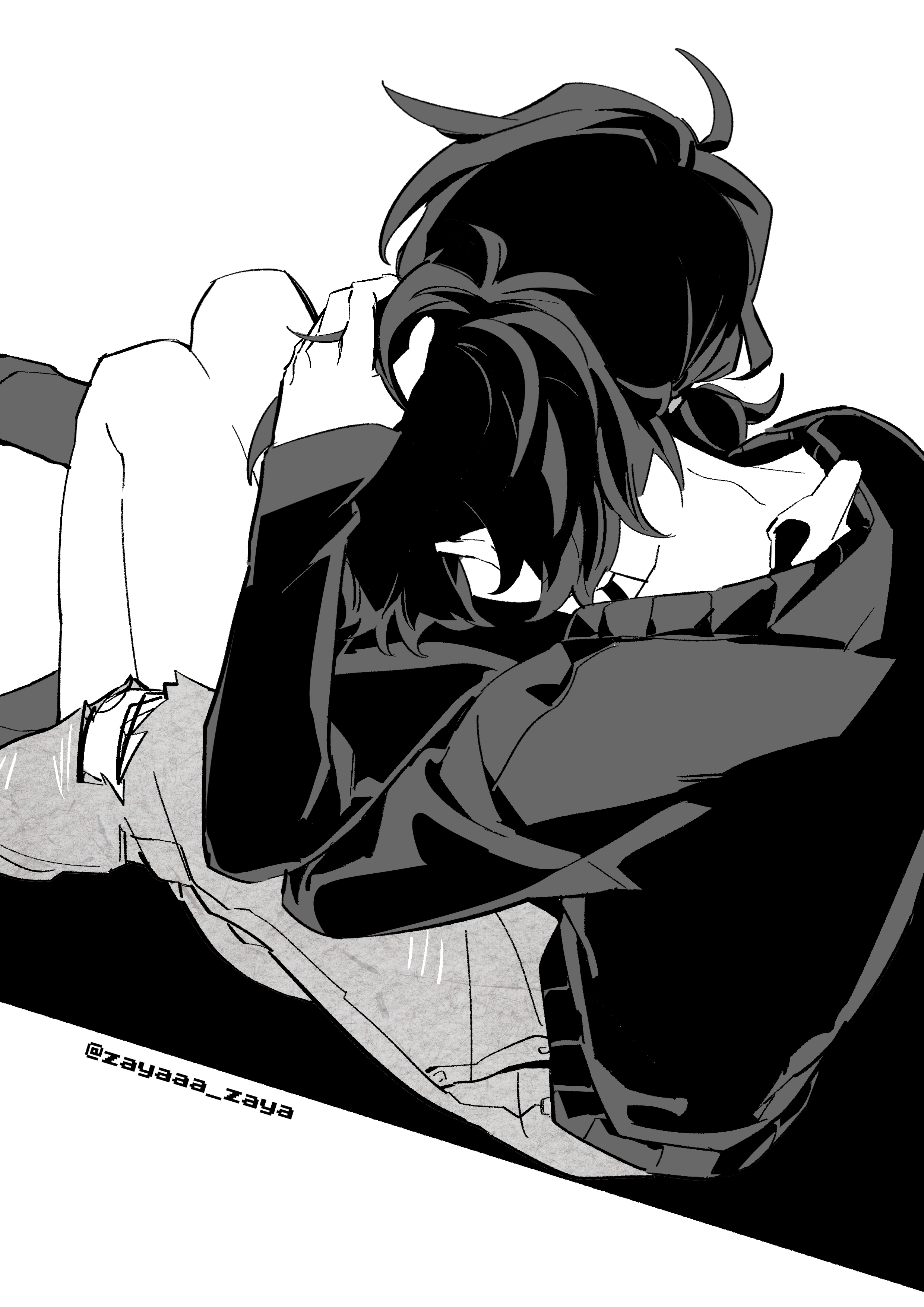 1boy 1girl absurdres ahoge andrew_graves antenna_hair arm_up ashley_graves bare_legs brother_and_sister chinese_commentary commentary_request denim feet_out_of_frame from_above from_behind greyscale hand_on_another's_head head_on_another's_shoulder high_contrast highres hug hug_from_behind hunched_over jeans knees_up long_sleeves low_ponytail medium_hair monochrome pants ponytail puffy_long_sleeves puffy_sleeves short_hair short_ponytail siblings simple_background sitting sitting_on_lap sitting_on_person sleeves_past_wrists sweater the_coffin_of_andy_and_leyley torn_clothes torn_jeans torn_pants twitter_username white_background zayaaa_zaya
