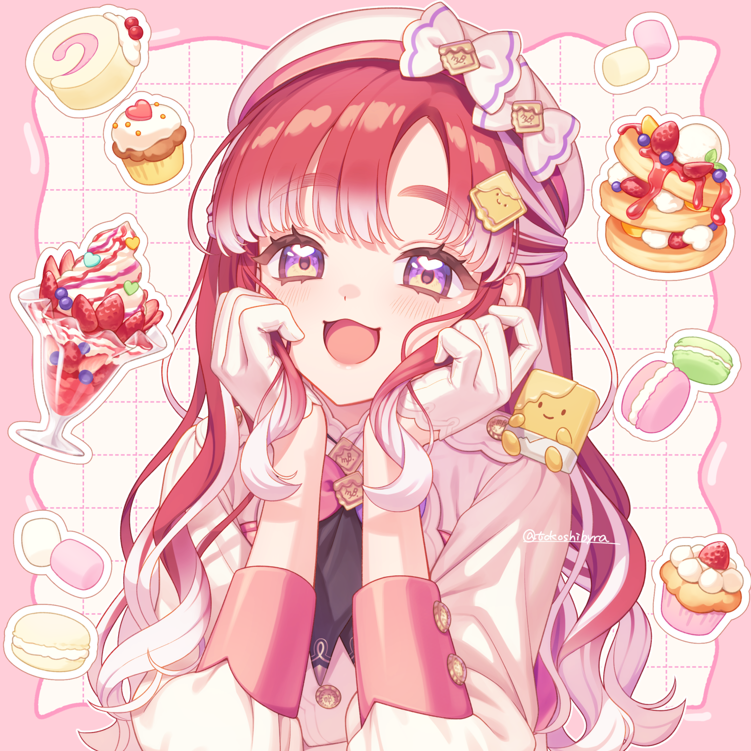 1girl :3 :d blush border commentary_request cup cupcake drinking_glass food fruit gloves gradient_hair grid_background half_gloves hat head_rest highres long_hair long_sleeves looking_at_viewer macarn multicolored_hair nijisanji open_mouth outline outside_border pancake parfait parfait_glass parted_bangs pink_border purple_eyes red_hair saotome_berry shirt smile solo strawberry thick_eyebrows tokoshibyra twitter_username upper_body virtual_youtuber white_background white_gloves white_hair white_hat white_outline white_shirt
