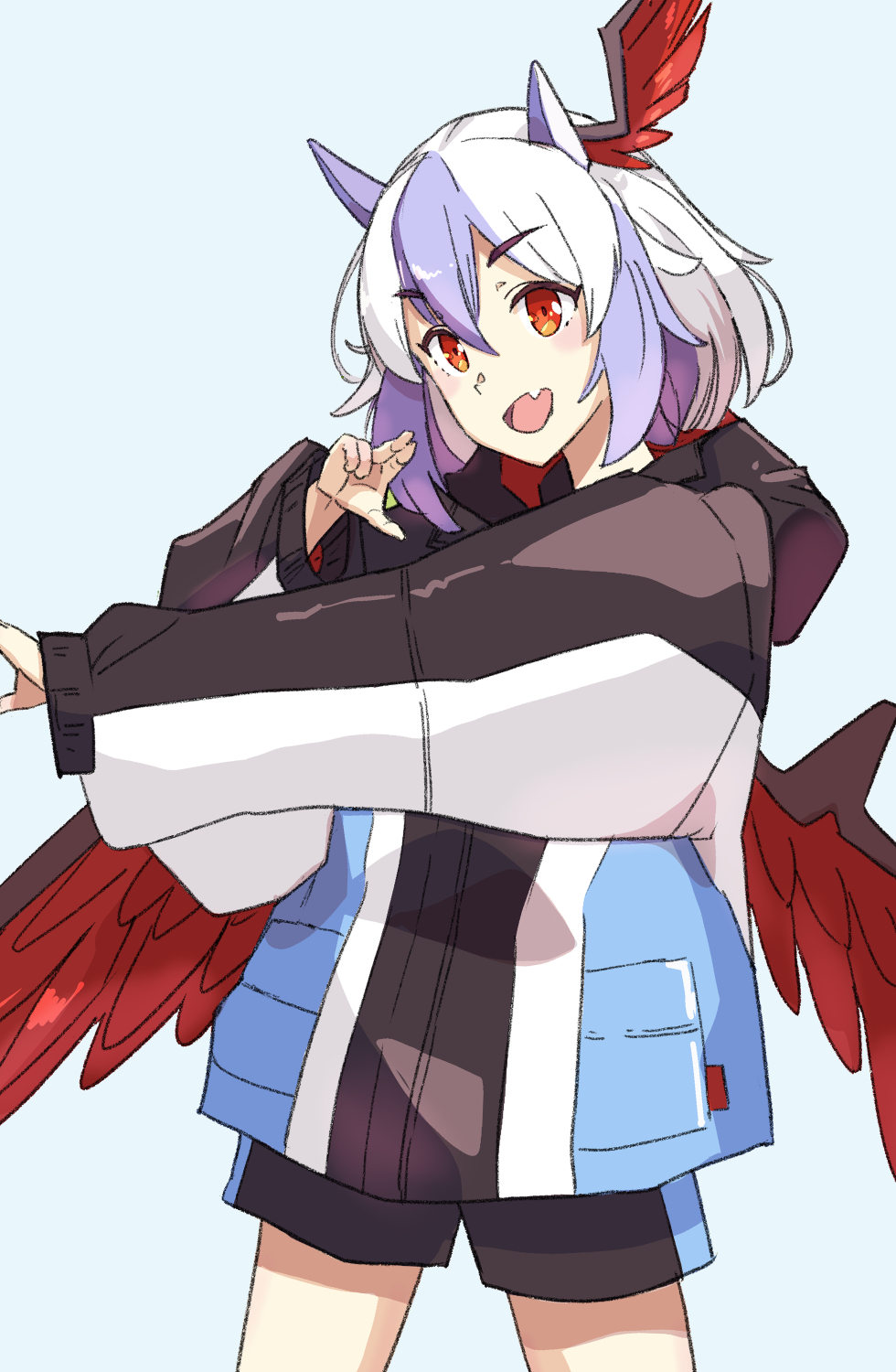 1girl alternate_costume bird_wings black_jacket black_shorts blue_background blue_hair blue_jacket blue_shorts commentary_request fang feathered_wings head_wings highres horns jack_(wkm74959) jacket long_sleeves looking_at_viewer medium_hair multicolored_hair multicolored_jacket one-hour_drawing_challenge open_mouth red_eyes red_wings shorts simple_background single_head_wing skin_fang smile solo tokiko_(touhou) touhou two-tone_hair two-tone_shorts white_hair white_jacket wings