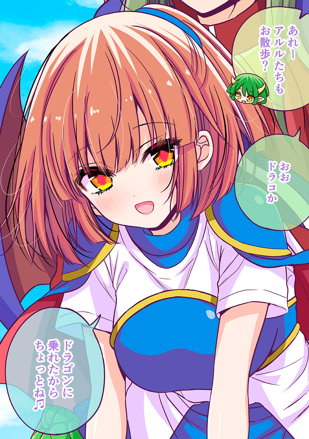 2girls :d arle_nadja blue_skirt blue_sky brown_eyes brown_hair brown_wings china_dress chinese_clothes cloud commentary_request day draco_centauros dragon_girl dragon_horns dragon_tail dragon_wings dress green_hair highres horns madou_monogatari multiple_girls open_mouth outdoors ponytail puyopuyo red_dress shirt shiwasu_horio short_sleeves skirt sky smile solo_focus tail translation_request white_shirt wings