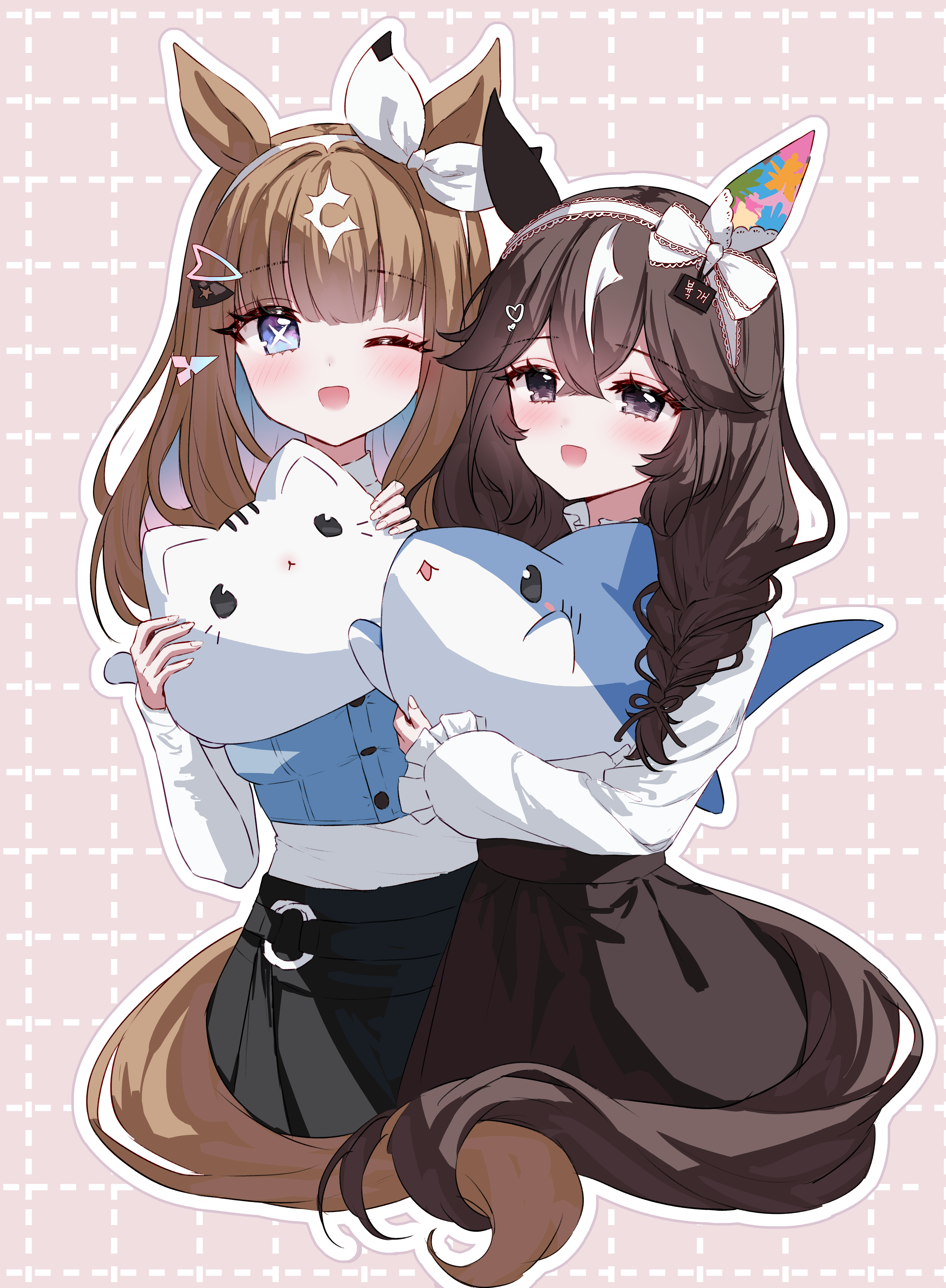 2girls absurdres almond_eye_(casual)_(umamusume) almond_eye_(umamusume) black_eyes black_hair black_skirt black_tail blue_eyes blue_hair blue_vest bow bow_hairband brown_hair brown_tail colored_inner_hair cross-shaped_pupils crossed_bangs curren_bouquetd'or_(umamusume) hair_between_eyes hair_ornament hairband hairclip highres holding holding_stuffed_toy multicolored_hair multiple_girls one_eye_closed open_mouth shirt skirt smile streaked_hair stuffed_animal stuffed_cat stuffed_shark stuffed_toy symbol-shaped_pupils tandohark textless_version too_many_hair_ornaments turtleneck turtleneck_shirt umamusume vest white_bow white_shirt white_streaks x-shaped_pupils