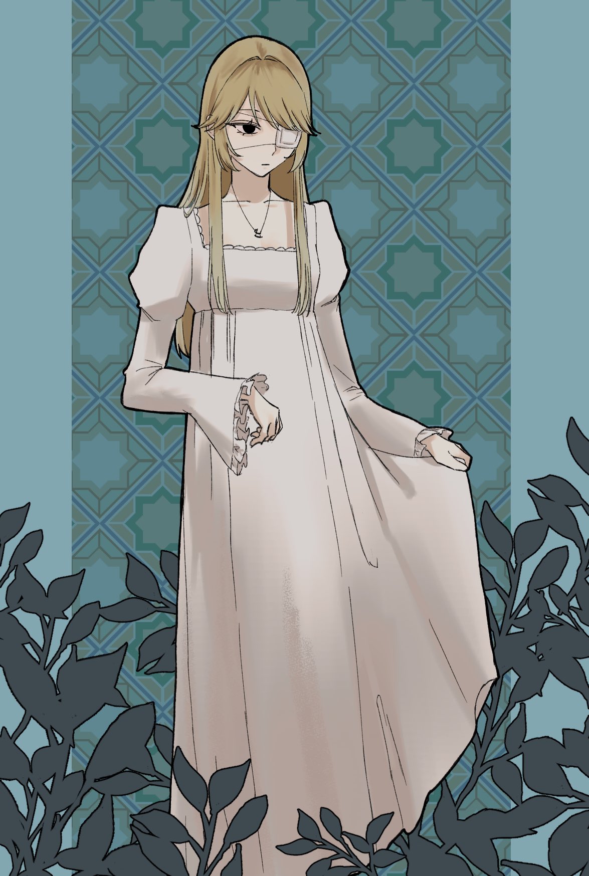 1girl art_nouveau black_eyes blonde_hair dress eyepatch feet_out_of_frame frilled_sleeves frills genderswap genderswap_(mtf) griffin_stewart highres holding_own_dress jewelry juliet_sleeves long_dress long_hair long_sleeves necklace oshi_no_taisetsuna_hito_ni_narikawaru puffy_sleeves solo square_neckline straight_hair sukiyakidane swept_bangs very_long_hair white_dress