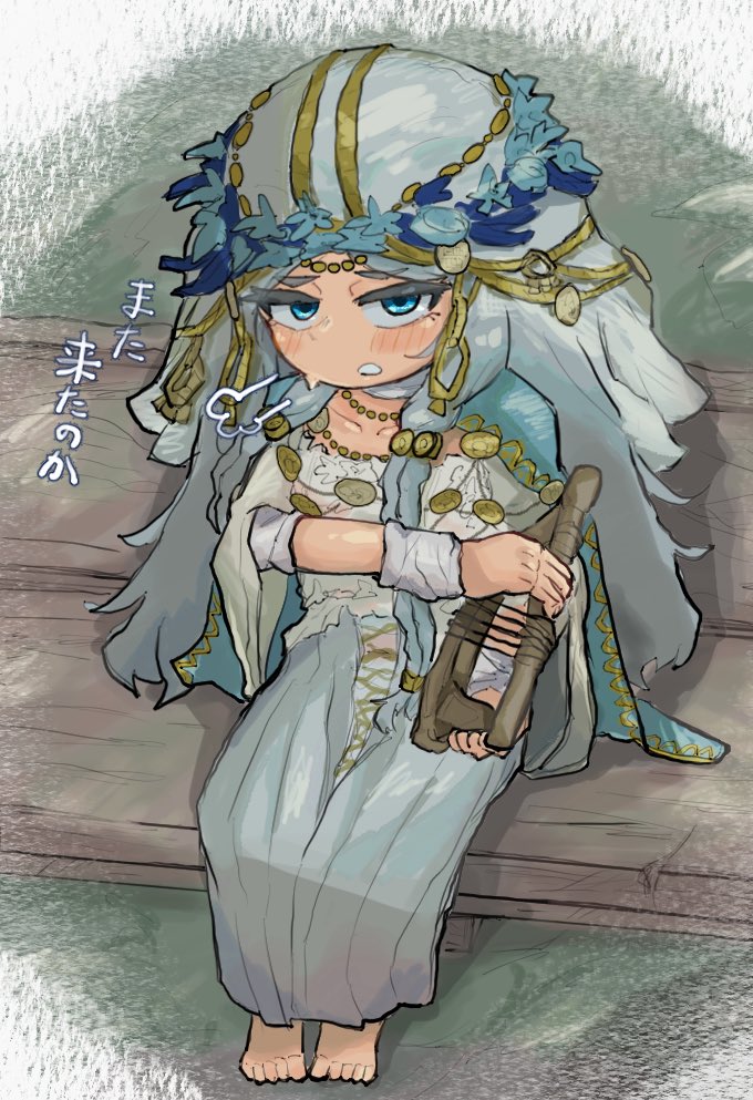 1girl blue_eyes blush braid doll_joints dress elden_ring elden_ring_nightreign flower_wreath hat head_wreath holding holding_instrument holding_lyre instrument jewelry joints long_hair looking_at_viewer low_twin_braids lyre revenant_(elden_ring) sitting solo twin_braids white_dress white_hair