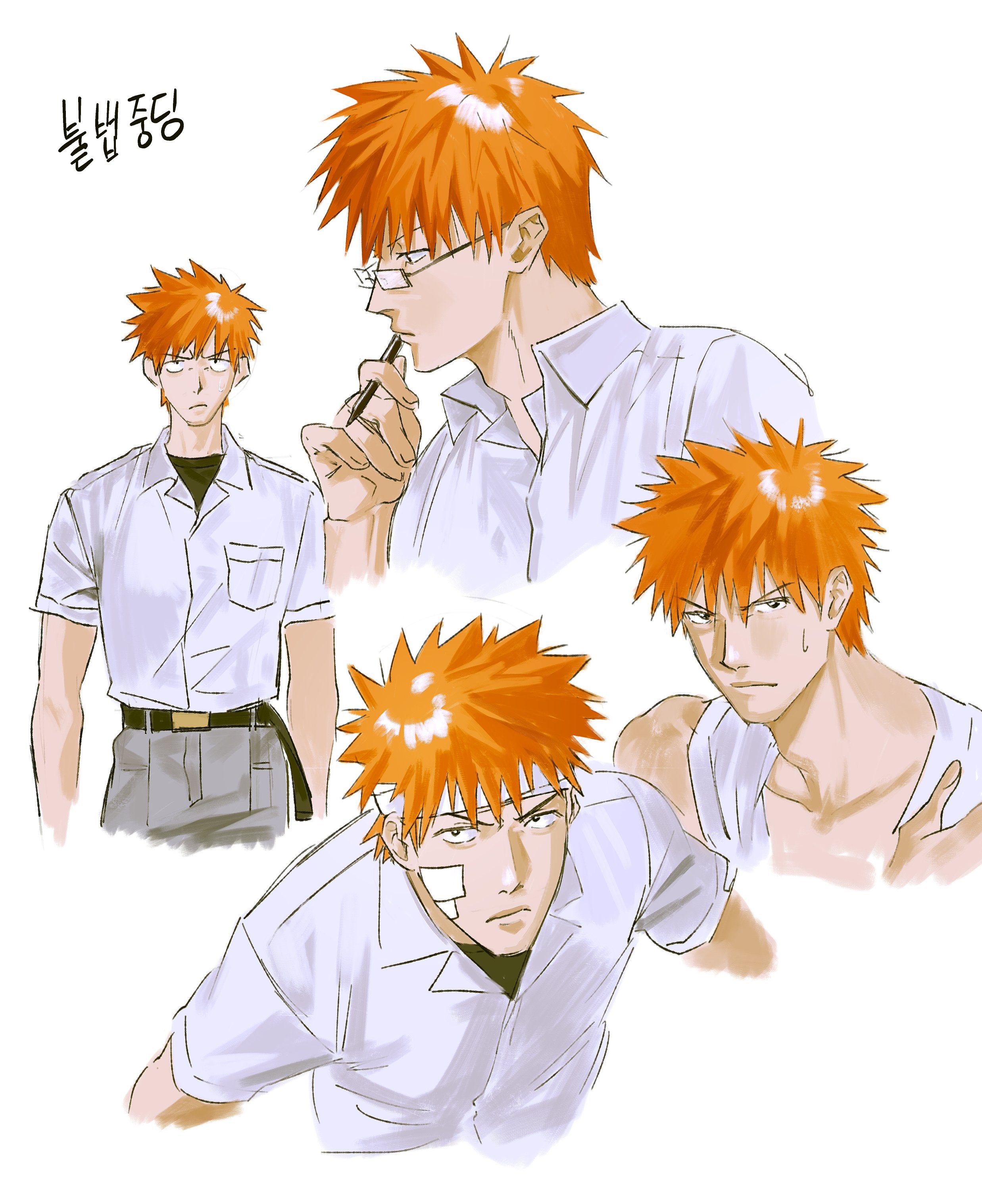 1boy absurdres bandaged_head bandages bandaid bandaid_on_cheek bandaid_on_face belt bespectacled black_belt black_shirt bleach breast_pocket collared_shirt commentary_request cropped_shoulders glasses grey_pants highres holding holding_pen korean_commentary korean_text kurosaki_ichigo male_focus multiple_views orange_hair pants pen pocket rectangular_eyewear shirt shirt_tucked_in short_hair simple_background towel towel_around_neck undershirt upper_body white_background white_shirt xatavo9919