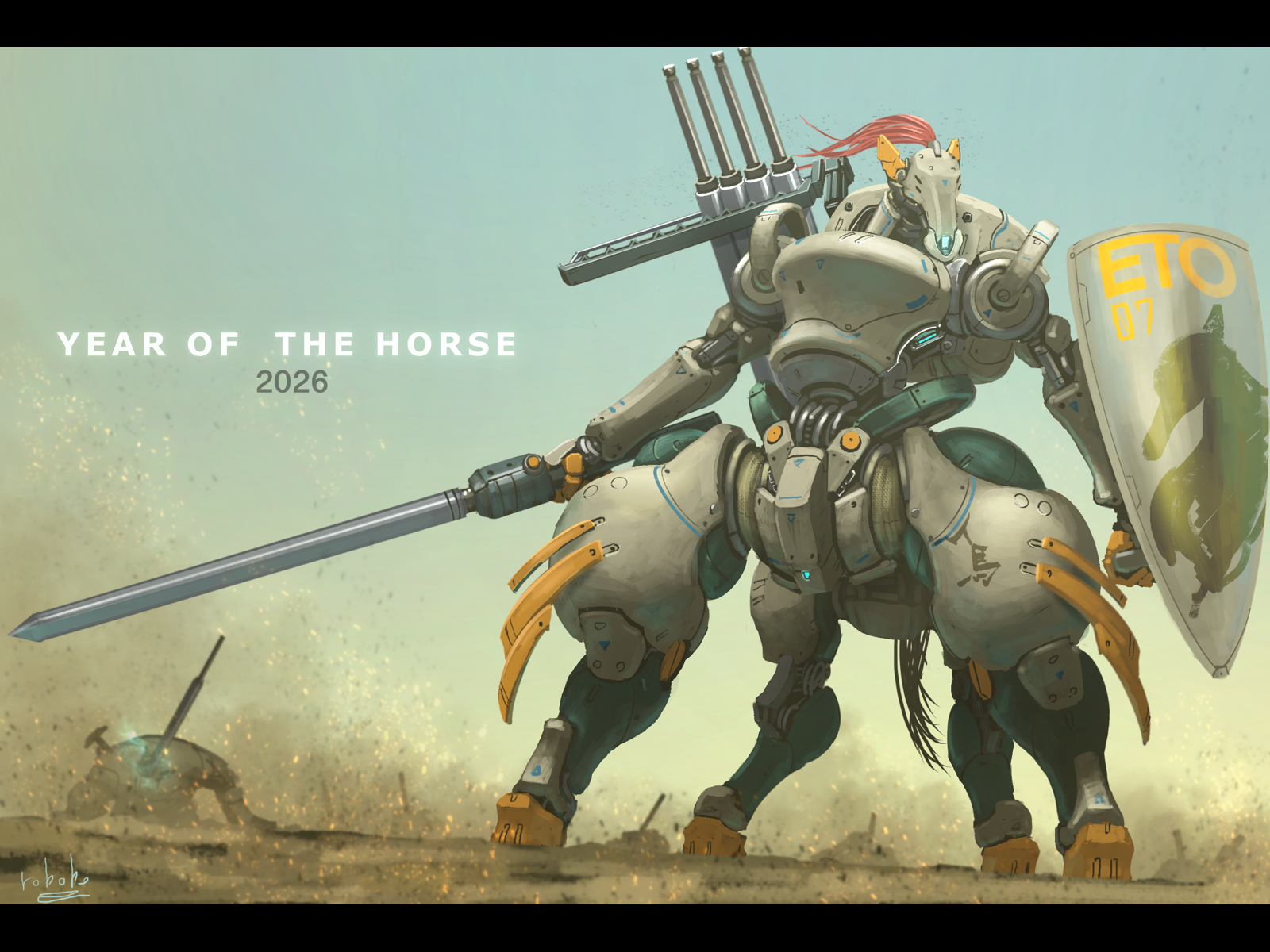 2026 animal_ears artist_name bottoms1237 centaur chinese_zodiac commentary_request damaged dated day desert highres holding holding_shield holding_sword holding_weapon hooves horse_ears horse_tail impaled joints letterboxed mecha mecha_focus missile_pod no_humans original outdoors partial_commentary ponytail red_hair robot robot_joints science_fiction shield shoulder_cannon signature sparks sword tail taur weapon year_of_the_horse