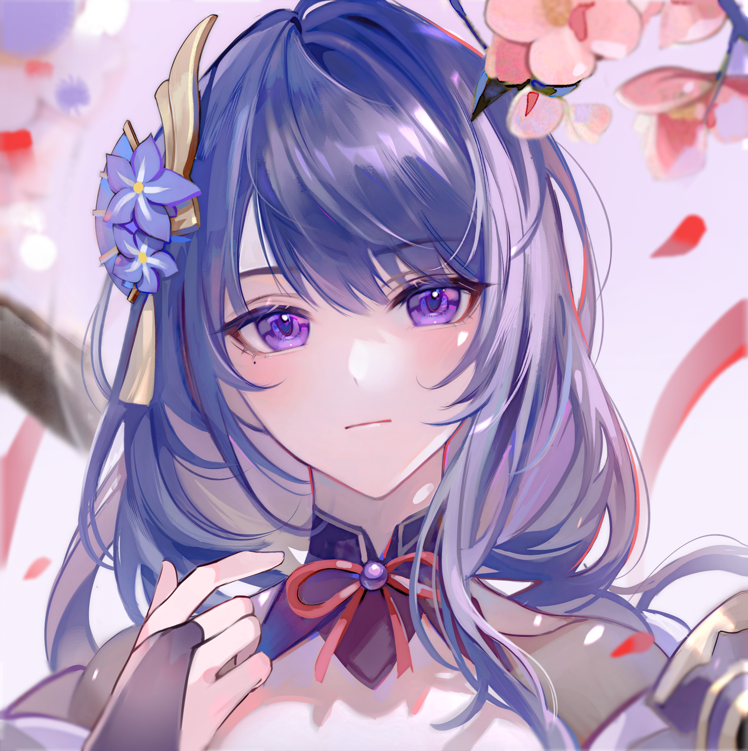 1girl absurdres armor blunt_bangs braid branch bridal_gauntlets cherry_blossoms chinese_commentary close-up closed_mouth clothing_cutout commentary_request genshin_impact hair_ornament head_tilt highres japanese_clothes kimono light_blush looking_at_viewer mole mole_under_eye neck_ribbon off_shoulder purple_background purple_eyes purple_hair purple_kimono raiden_shogun red_ribbon ribbon shade shoulder_armor shoulder_cutout single_braid solo upper_body xiwen800