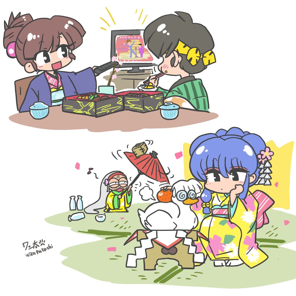 1boy 3girls artist_name bandana bird black_hair brown_hair chibi chopsticks cologne_(ranma_1/2) commentary_request controller double_bun duck eating food fruit glasses grey_hair hair_bun hibiki_ryouga holding holding_chopsticks japanese_clothes kimono kuonji_ukyou mousse_(duck)_(ranma_1/2) multiple_girls open_mouth orange_(fruit) purple_hair ranma_1/2 remote_control shampoo shampoo_(ranma_1/2) smile television wanta_(futoshi) watching_television wide_sleeves yukata