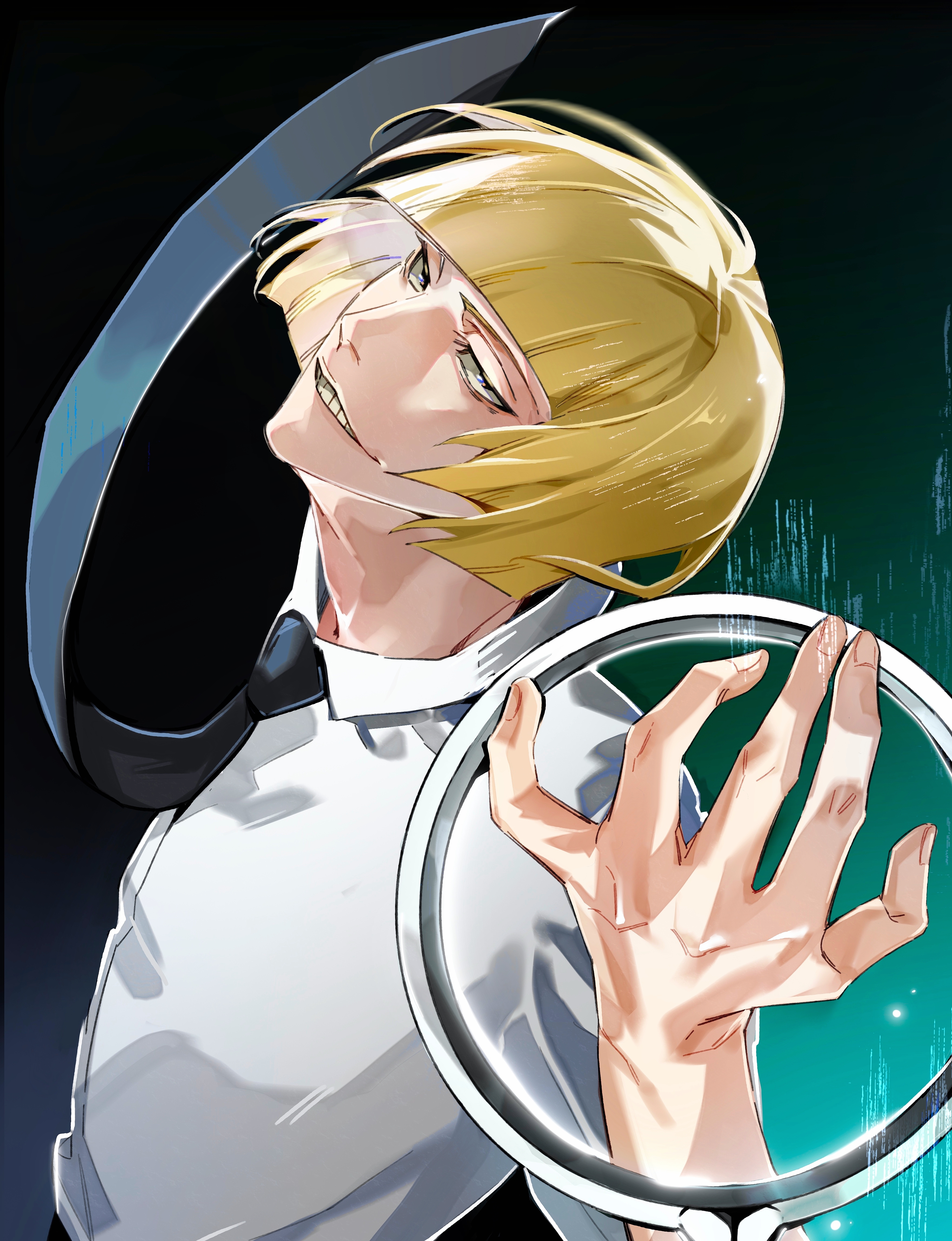 1boy absurdres black_necktie bleach blonde_hair blunt_bangs collared_shirt commentary_request floating_hair highres hirako_shinji looking_at_viewer male_focus necktie sakanade_(shikai) shikai shirt short_hair solo teeth upper_body white_shirt xiaoqinglongtang42487 zanpakutou