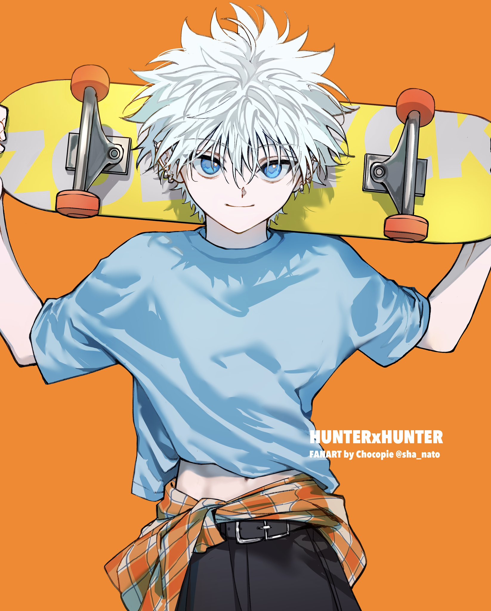 1boy arms_up belt black_belt blue_eyes blue_shirt closed_mouth clothes_around_waist commentary copyright_name crew_neck highres holding holding_skateboard hunter_x_hunter killua_zoldyck male_focus midriff_peek navel orange_background parted_hair sha_nato shirt shirt_around_waist short_hair short_sleeves simple_background skateboard smile solo untranslatable_commentary white_hair