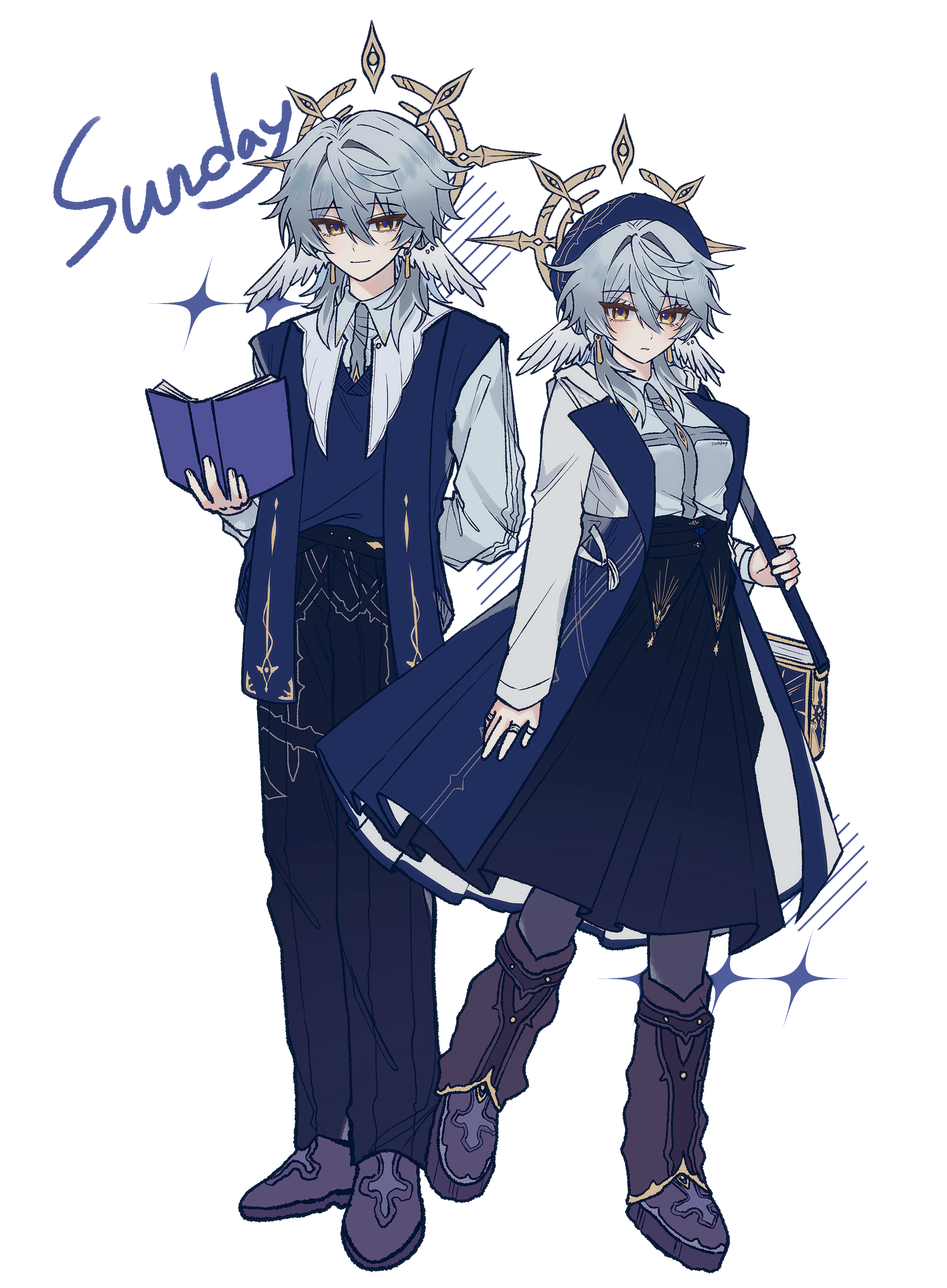 1boy 1girl absurdres arm_behind_back bag black_shoes black_skirt blue_hat blue_vest book breasts character_name commentary_request dual_persona earrings feathered_wings full_body genderswap genderswap_(mtf) grey_hair hair_between_eyes halo halo_behind_head hat head_wings highres holding holding_book holding_strap honkai:_star_rail honkai_(series) jewelry kin_(k27i7n) long_sleeves looking_at_viewer medium_breasts medium_hair multiple_rings official_alternate_costume open_book piercing ring shirt shoes shoulder_bag simple_background skirt spiked_halo sunday_(honkai:_star_rail) sunday_(impression)_(honkai:_star_rail) vest white_background white_shirt wing_piercing wings yellow_eyes