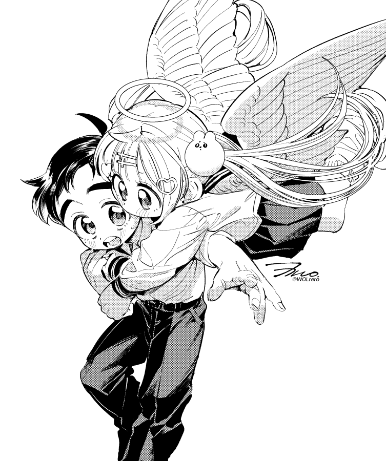 1boy 1girl angel bad_id bad_pixiv_id feathered_wings flying greyscale hair_ornament hairclip halo heart heart_hair_ornament hug hug_from_behind long_hair long_sleeves looking_at_another miharu_(wolrero) monochrome nichijou_kamoshirenai open_mouth original pants pleated_skirt sailor_collar school_uniform serafuku shirt short_hair signature skirt sora_(wolrero) standing surprise_hug surprised traditional_halo twintails white_background wings wolrero
