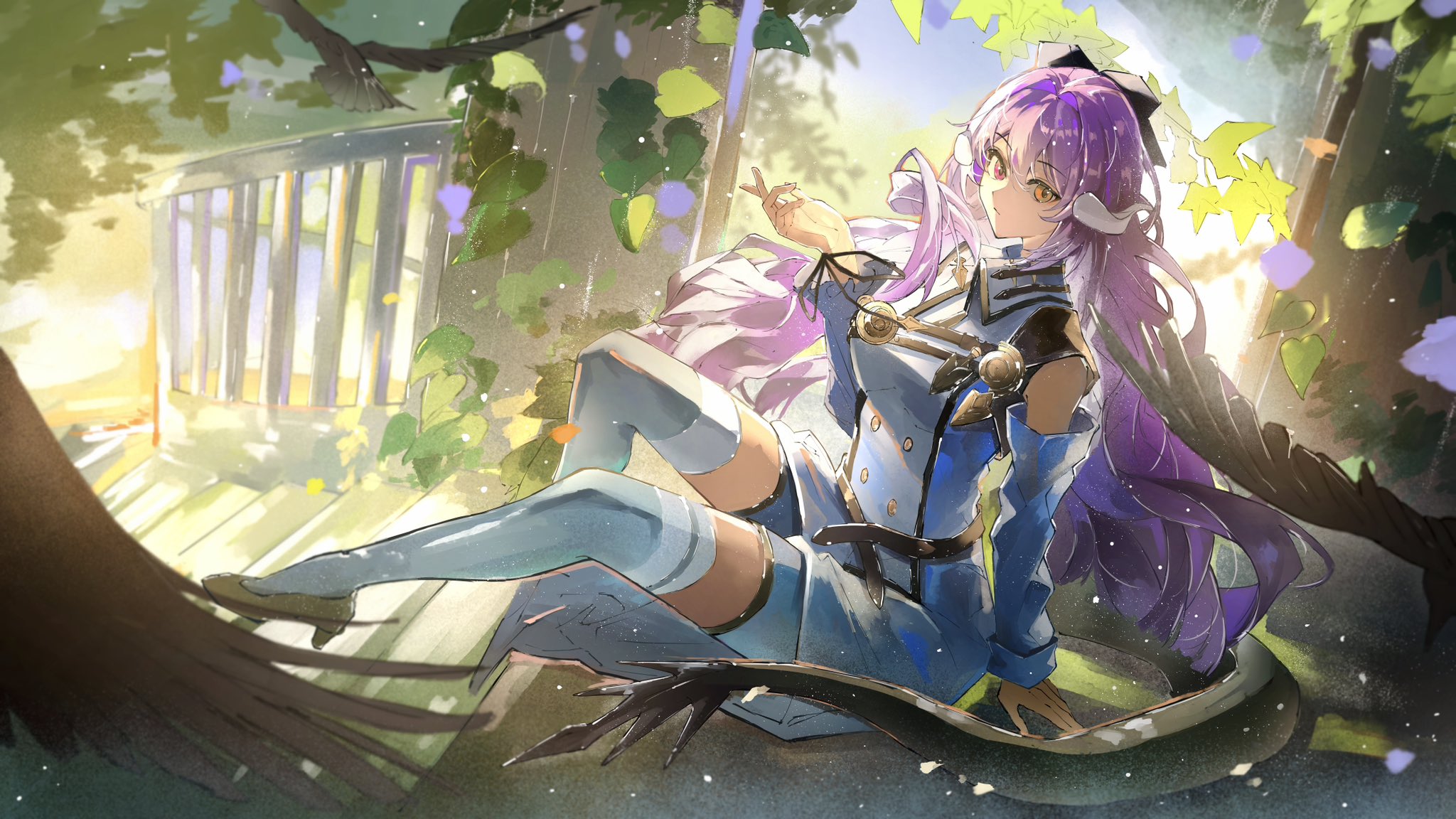 1girl bird black_bird commentary_request dress flower heterochromia highres horns leaf long_hair orange_eyes original purple_flower purple_hair red_eyes shorts sitting solo tail thighhighs watabosi_28 white_shorts white_thighhighs
