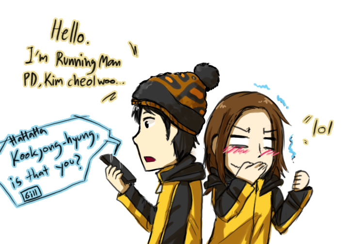 black_hair brown_hair cellphone english_text hat laughing lee_kwang_soo phone real_life running_man song_ji-hyo