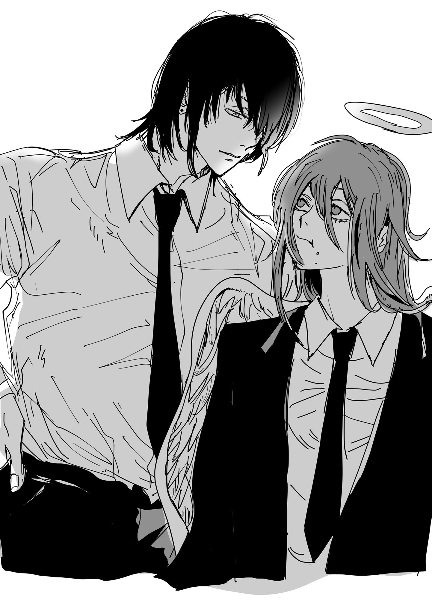 2boys angel_devil_(chainsaw_man) angel_wings chainsaw_man closed_mouth collared_shirt commentary_request cropped_legs earrings hair_undone halo hayakawa_aki height_difference highres jacket jewelry long_hair looking_at_another male_focus mikiouji1 multiple_boys necktie open_clothes open_jacket shirt shirt_tucked_in short_hair simple_background suit_jacket white_background wings