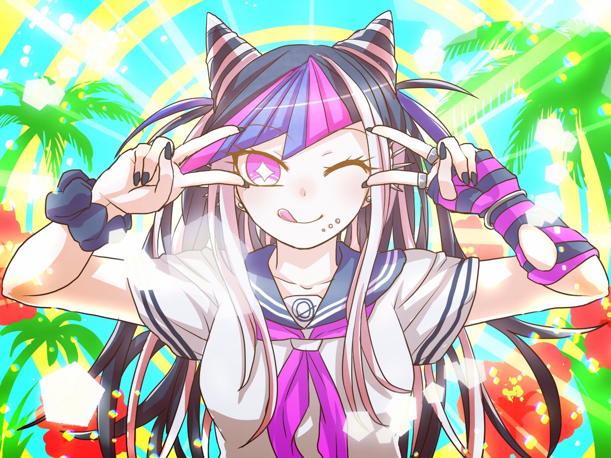 +_+ 1girl black_hair black_nails blue_hair blue_sailor_collar blue_streaks collarbone collared_shirt commentary_request danganronpa_(series) danganronpa_2:_goodbye_despair double_v ear_piercing elbow_gloves eyelashes face_piercing fingerless_gloves fingernails flower gloves hair_horns jewelry lens_flare long_hair mioda_ibuki mouth_piercing multicolored_gloves multicolored_hair multiple_rings nail_polish neckerchief palm_tree piercing pink_eyes pink_hair pink_neckerchief pink_streaks red_flower ring sailor_collar shirt short_sleeves single_elbow_glove single_fingerless_glove solo straight-on streaked_hair striped_clothes striped_gloves tree two-tone_gloves upper_body v white_hair white_shirt zi_huahuo