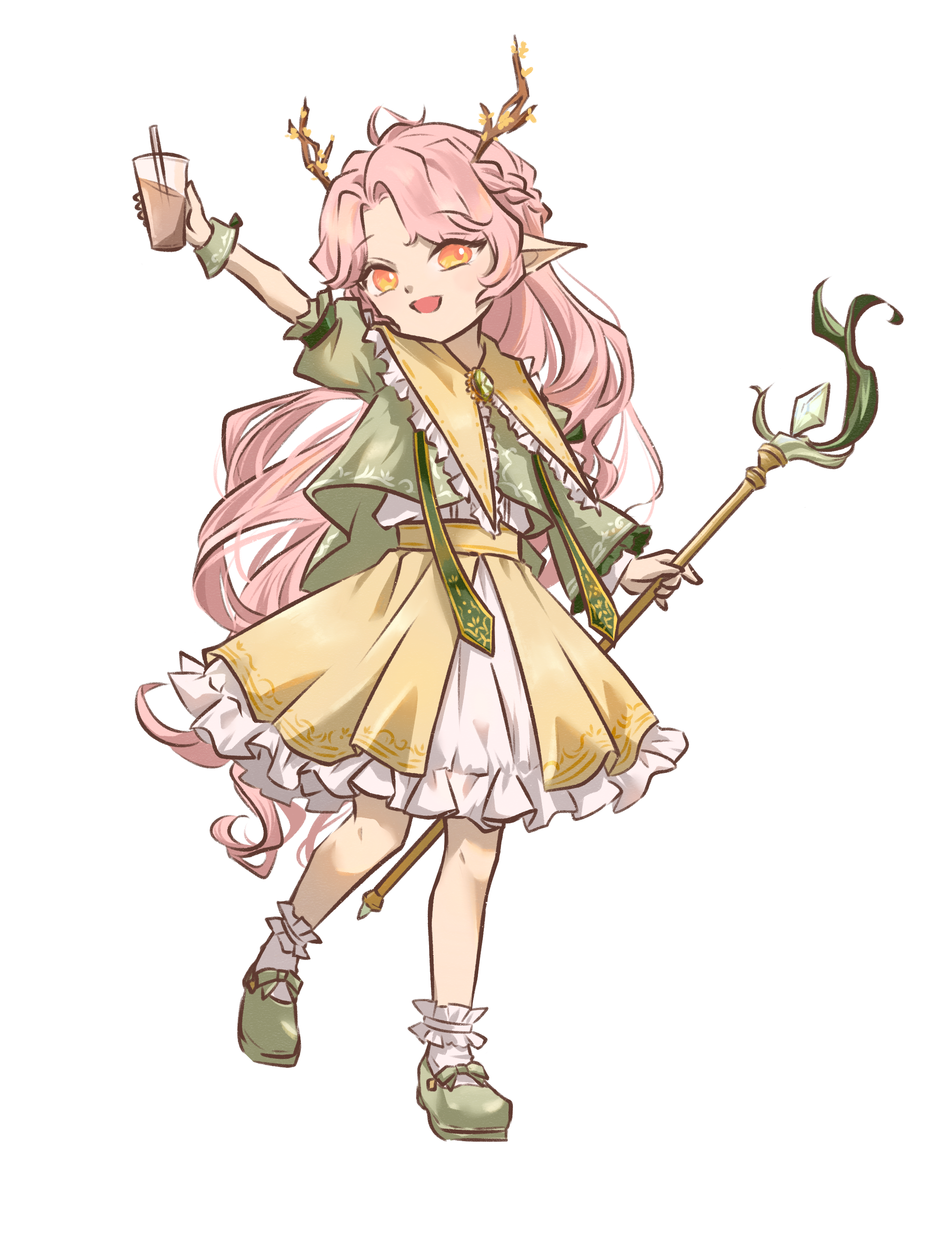 1girl absurdres anabellnordin braid chest_jewel commentary_request crown_braid cup dress drinking_straw fairy full_body gem green_gem green_shoes head_tilt highres holding holding_cup holding_staff horns long_hair looking_at_viewer milk_tea open_mouth orange_eyes original pink_hair pointy_ears shoes simple_background single_sleeve socks solo staff standing very_long_hair white_background white_socks wide_sleeves wrist_cuffs yellow_dress