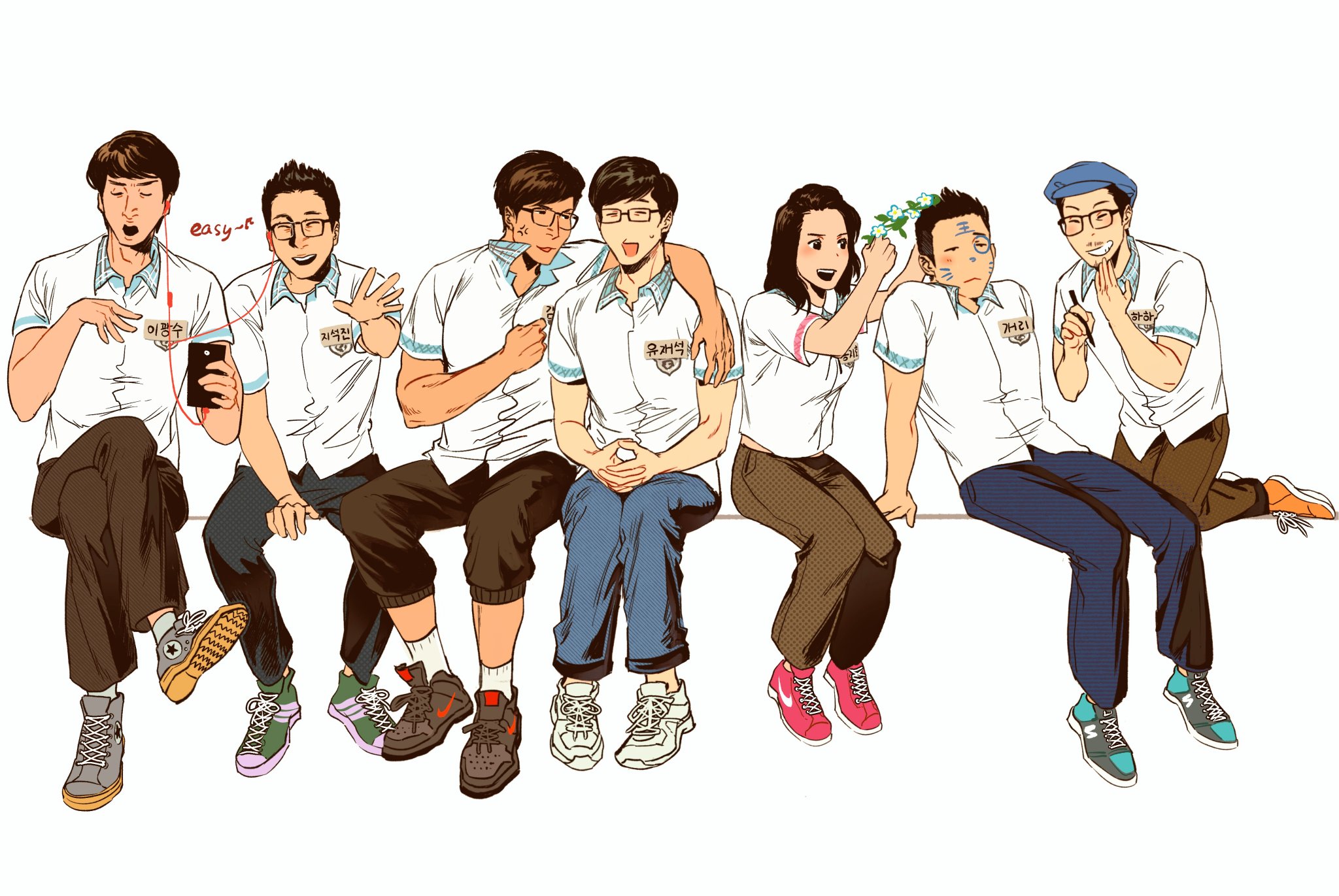 black_hair borderline7839 brown_hair converse drawing_on_another's_face glasses ha_dong_hoon hat head_wreath headphones ji_seok_jin kang_gary kim_jong_kook lee_kwang_soo listening_to_music name_tag new_balance nike_(company) real_life running_man shoes sneakers song_ji-hyo yoo_jae_seok