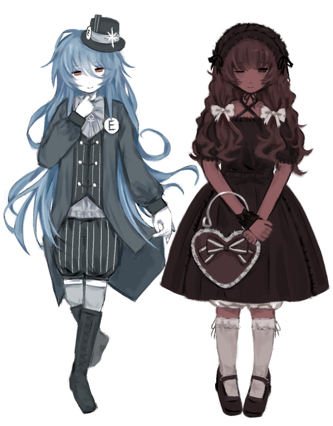 2girls blue_hair boots bow brown_dress brown_hair closed_mouth dress eunoia_(frozen_soul) expressionless frozen_soul full_body grey_boots grey_jacket grey_shorts grey_thighhighs hair_bow highres jacket long_hair low-tied_sidelocks multiple_girls nashatra_bealdhild ouji_fashion princeloch puffy_short_sleeves puffy_sleeves red_eyes roblox short_sleeves shorts sidelocks simple_background socks thighhighs very_long_hair wavy_hair white_background white_bow white_socks