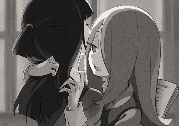 2girls bad_id bad_tumblr_id blurry blurry_background bright_pupils facing_away film_grain from_behind from_side greyscale hair_over_one_eye half-closed_eyes half_updo hand_up hug kagari_atsuko kirusu little_witch_academia long_hair long_sleeves looking_at_another luna_nova_school_uniform monochrome multiple_girls one_eye_covered open_mouth paper school_uniform sharp_teeth sidelighting sleeve_cuffs sucy_manbavaran teeth upper_body upper_teeth_only wing_collar yuri