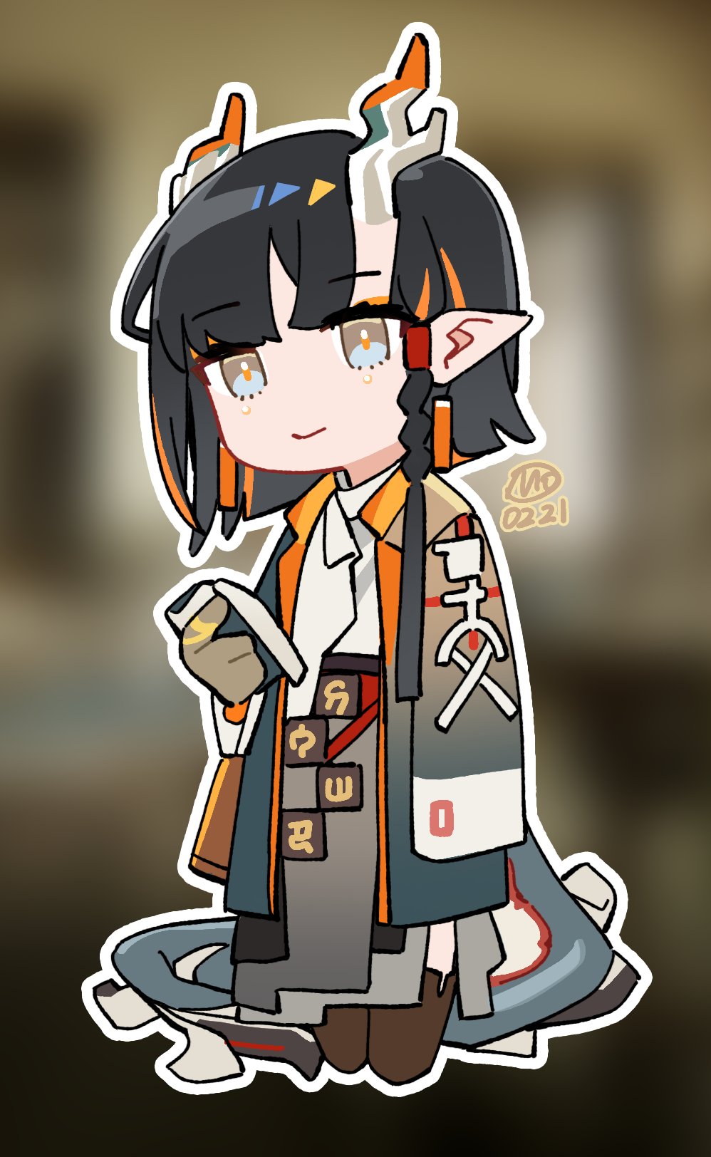 1girl arknights black_hair book boots brown_eyes chibi chibi_only commentary_request dragon_horns dragon_tail earrings eastern_dragon_horns hashtag-only_commentary highres holding holding_book horns jewelry jie_(arknights) mochusama multicolored_hair pointy_ears robe signature smile tail tassel tassel_earrings