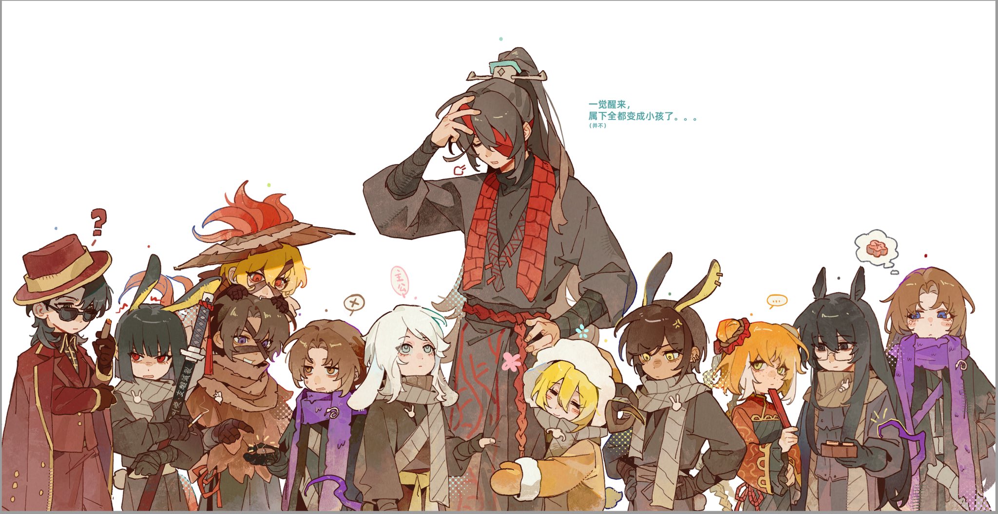 ... 6+boys 6+girls ? aged_down anger_vein animal_ears arm_up bandage_over_one_eye black_hair black_hanfu blonde_hair blue_eyes brown_eyes brown_hair chengnnnan chicken_boy chinese_clothes chinese_commentary chinese_text cigar coat coat_on_shoulders commentary_request don_quixote_(project_moon) droopy_ears faust_(project_moon) fur-trimmed_hood fur_trim gregor's_cockroach_(project_moon) gregor_(project_moon) group_picture hair_bun hanfu hat heishou_pack-mao_branch_(identity)_(project_moon) heishou_pack-si_branch_(identity)_(project_moon) heishou_pack-wei_branch_(identity)_(project_moon) heishou_pack-wu_branch_(identity)_(project_moon) heishou_pack-you_branch_(identity)_(project_moon) high_ponytail highres holding holding_bug holding_cigar hong_lu_(project_moon) hongyuan_(identity)_(project_moon) hood hood_up horns horse_boy horse_ears hug ishmael_(project_moon) leg_grab limbus_company long_hair long_sleeves meursault_(project_moon) mittens multiple_boys multiple_girls orange_hair outis_(project_moon) pants ponytail project_moon purple_eyes purple_scarf rabbit_ears rabbit_girl rabbit_ornament rabbit_tail red_bandage red_coat red_eyes red_hat red_pants red_shrug rodion_(project_moon) rope_belt ryoshu_(project_moon) scarf sheep_girl sheep_horns shrug_(clothing) simple_background sinclair_(project_moon) spoken_ellipsis stole sunglasses tail thumb_(identity)_(project_moon) translation_request white_background white_hair xiao_guan_(headdress) yi_sang_(project_moon)