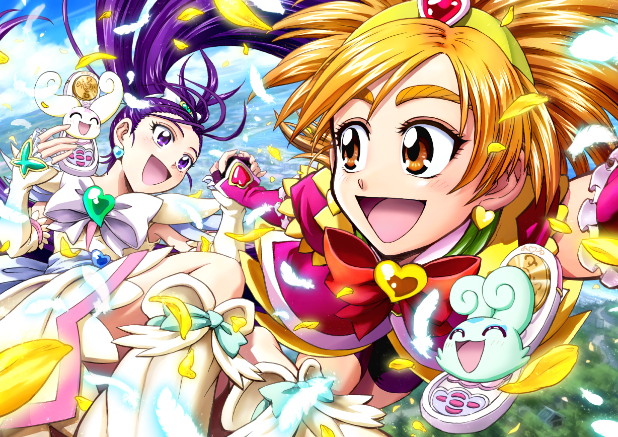 2girls bike_shorts black_shorts blue_sky boots bow bowtie brooch brown_eyes brown_hair cellphone choppy cloud cloudy_sky commentary cure_bloom cure_egret day dress earrings elbow_gloves flappy_(precure) flying foreshortening futari_wa_precure_splash_star gloves glowing_feather hair_ornament half_gloves heart heart_brooch heart_earrings heart_hair_ornament holding holding_hands holding_phone horizon hyuuga_saki jewelry looking_at_another looking_back magical_girl medium_hair mishou_mai mix_commune multiple_girls nakajima_majikana outdoors petals phone pink_dress pink_gloves ponytail precure purple_eyes purple_hair red_bow red_bowtie short_dress shorts shorts_under_dress sky white_boots white_bow white_bowtie white_dress white_gloves