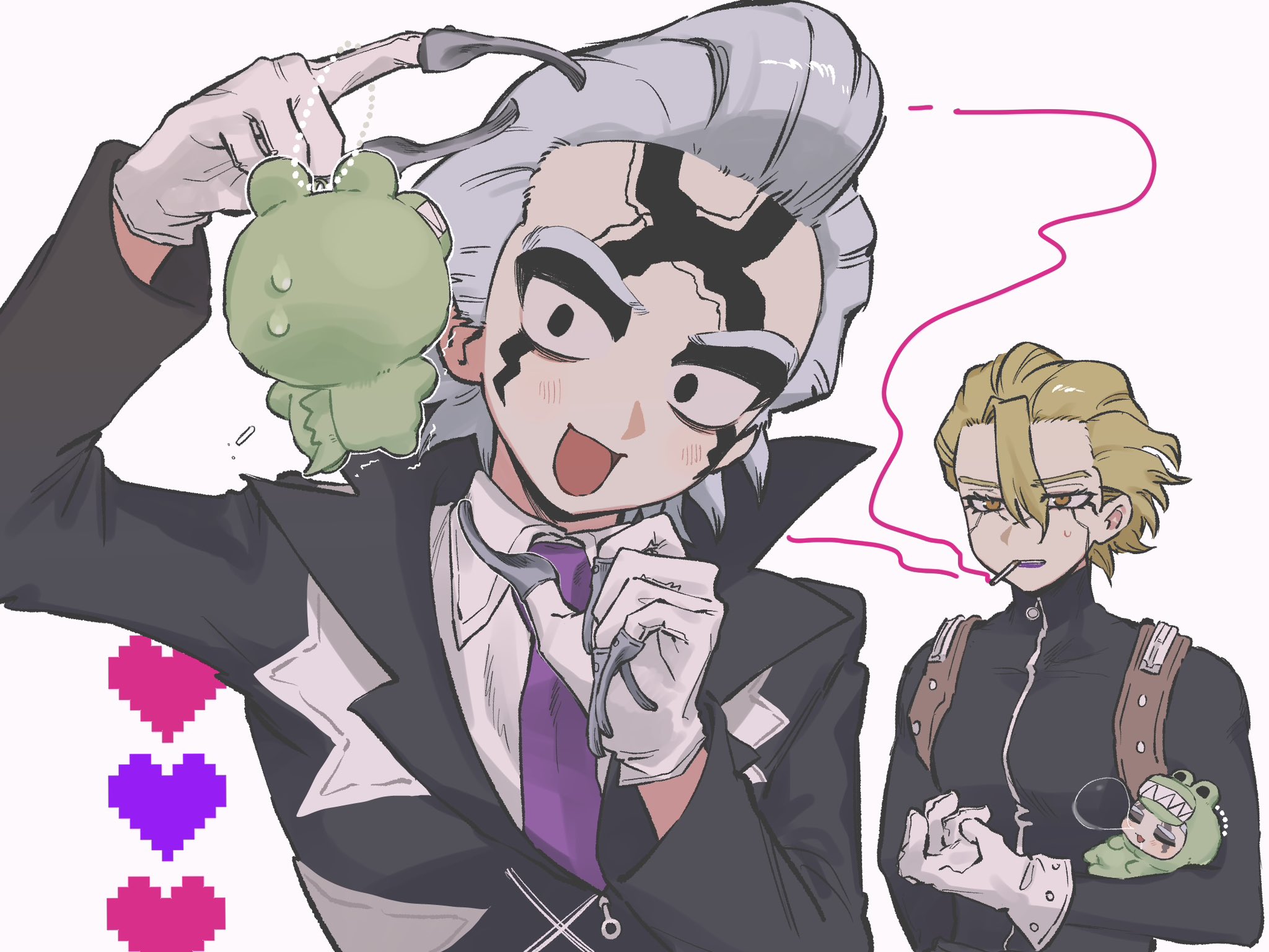 2boys black_eyes black_jacket blonde_hair cigarette coat collared_shirt commentary_request dr._stone facial_mark gloves grey_hair hair_between_eyes hair_slicked_back heart highres holding jacket long_sleeves makeup male_focus mini_person miniboy multiple_boys necktie nose_bubble open_mouth ovo999c purple_necktie shirt short_hair simple_background smile smoking stanley_snyder_(dr.stone) upper_body white_background white_gloves white_shirt xeno_(dr.stone) yellow_eyes