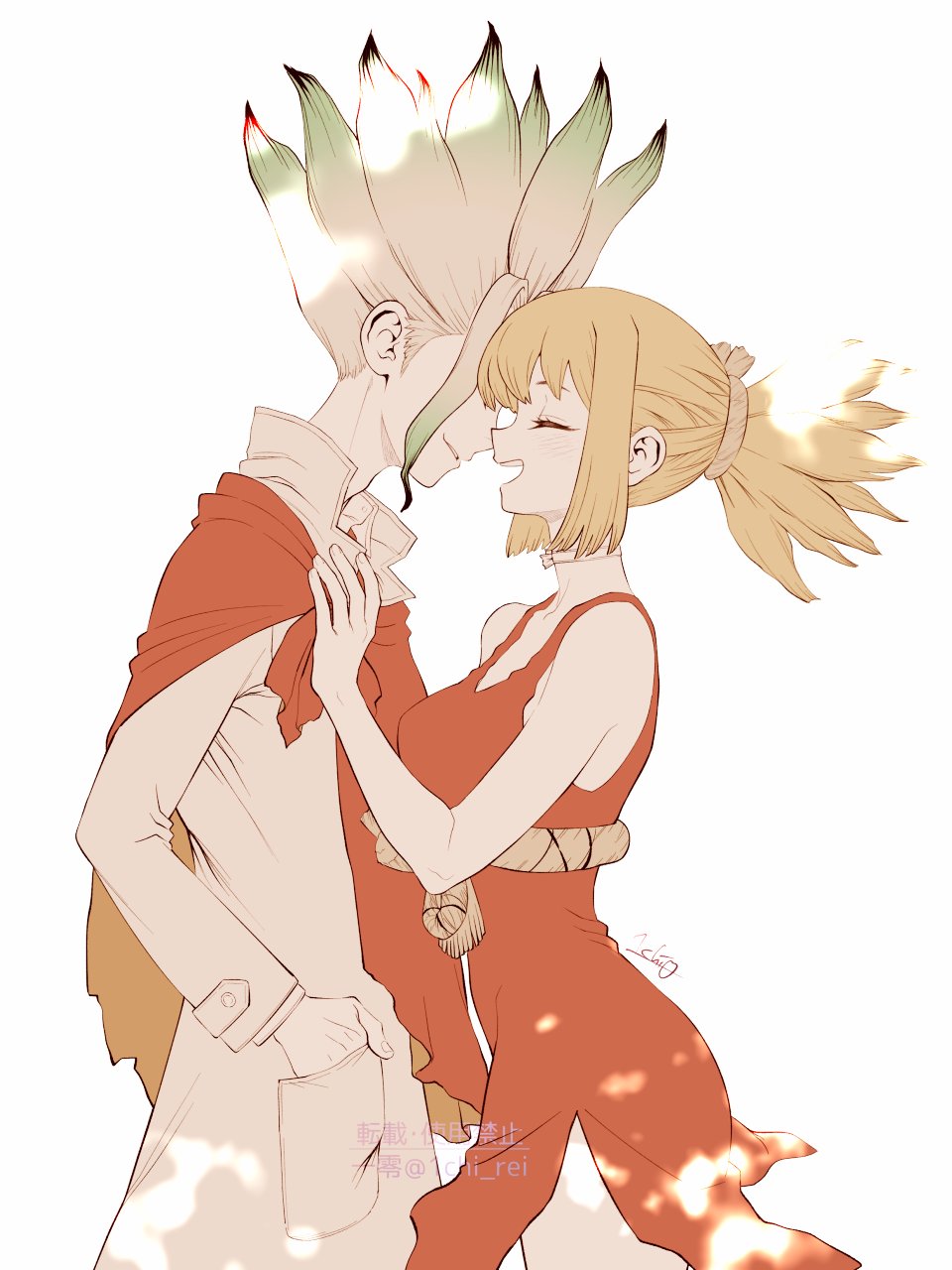 1boy 1girl blonde_hair breasts cape closed_eyes coat commentary_request dr._stone dress fiery_hair from_side gradient_hair green_hair hand_in_pocket highres ishigami_senkuu kohaku_(dr._stone) long_hair multicolored_hair ninomae_gin open_mouth ponytail red_cape red_dress rope_belt sidelocks simple_background sleeveless sleeveless_dress smile spiked_hair white_background